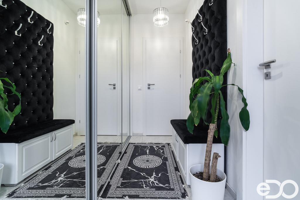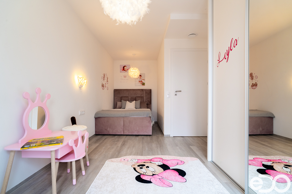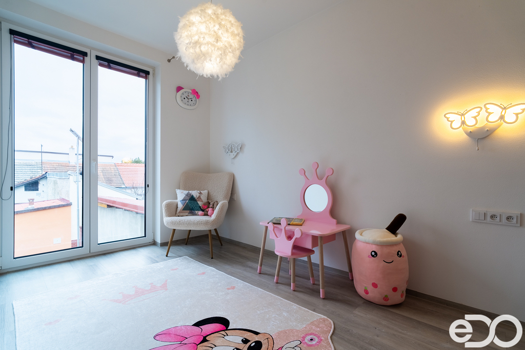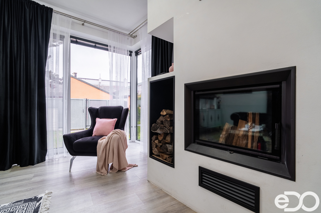 Vestavěný nábytek a krb dodávají interiéru hřejivý charakter a pohodlí, ideální pro společné večery. Celý prostor je doladěn elegantními křišťálovými lustry, které přinášejí šmrnc, ale zůstávají v souladu s praktickým, rodinně orientovaným využitím prostoru.