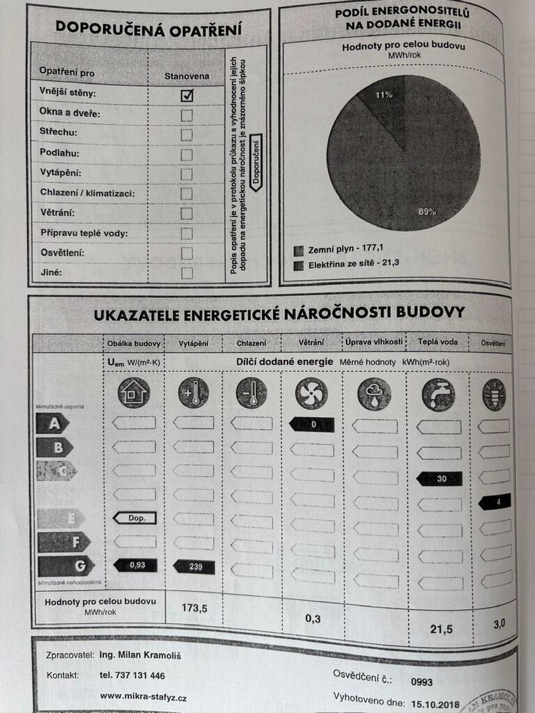 - Ukazatel energetické náročnosti budovy: 274 kWh/m²