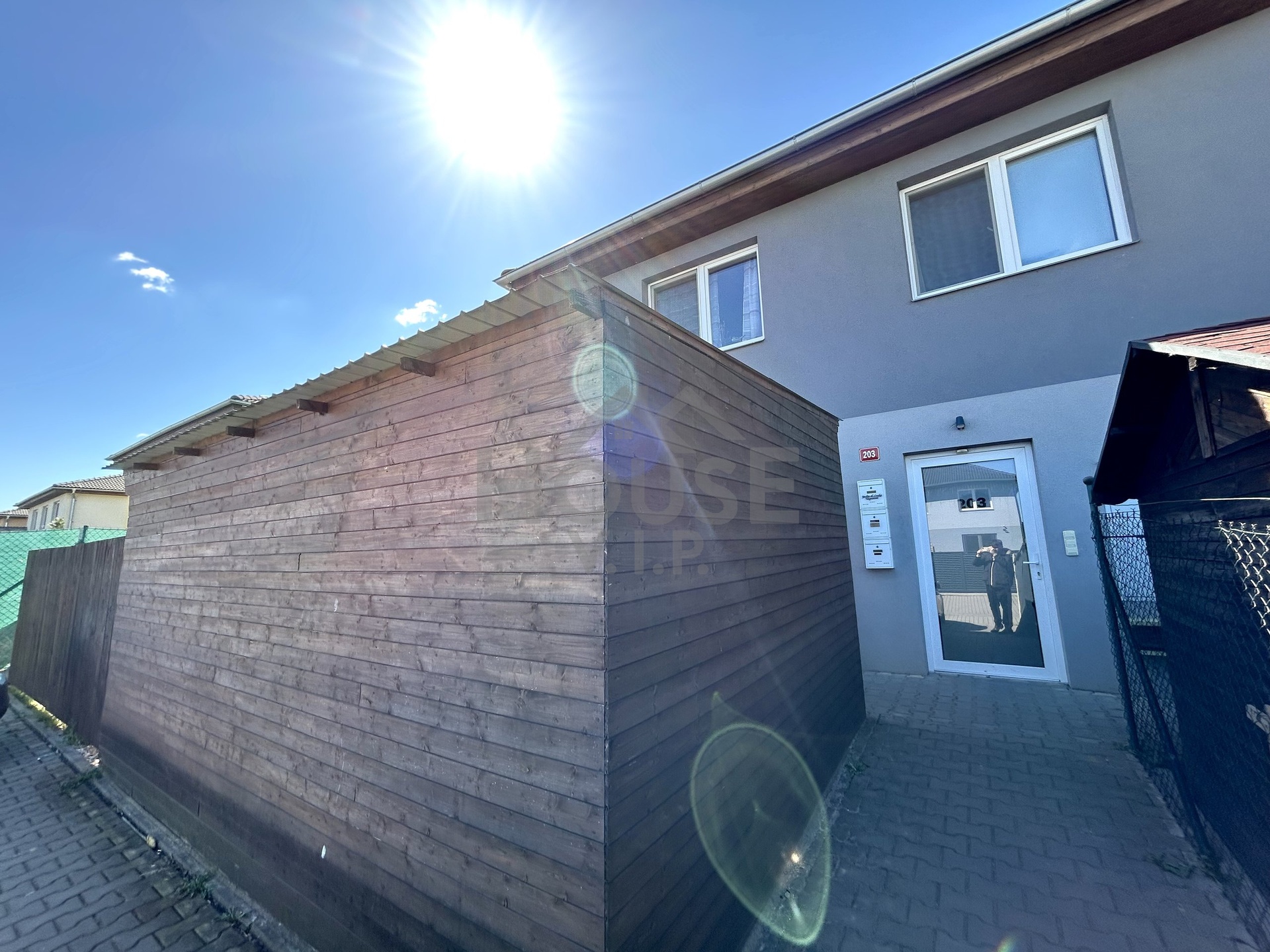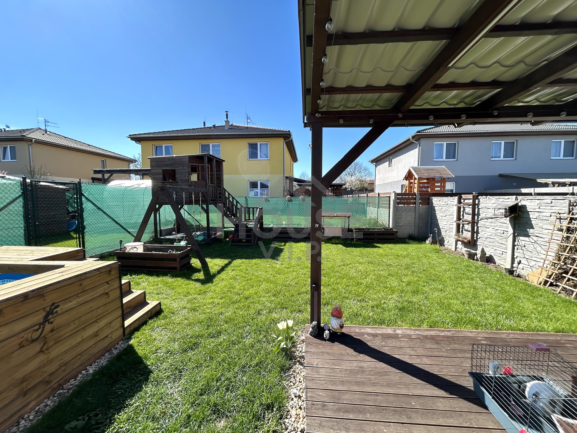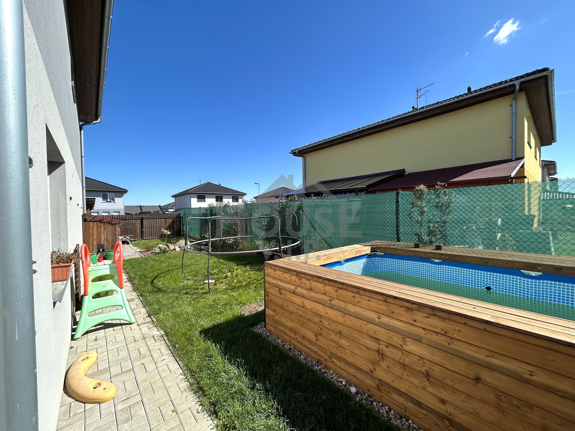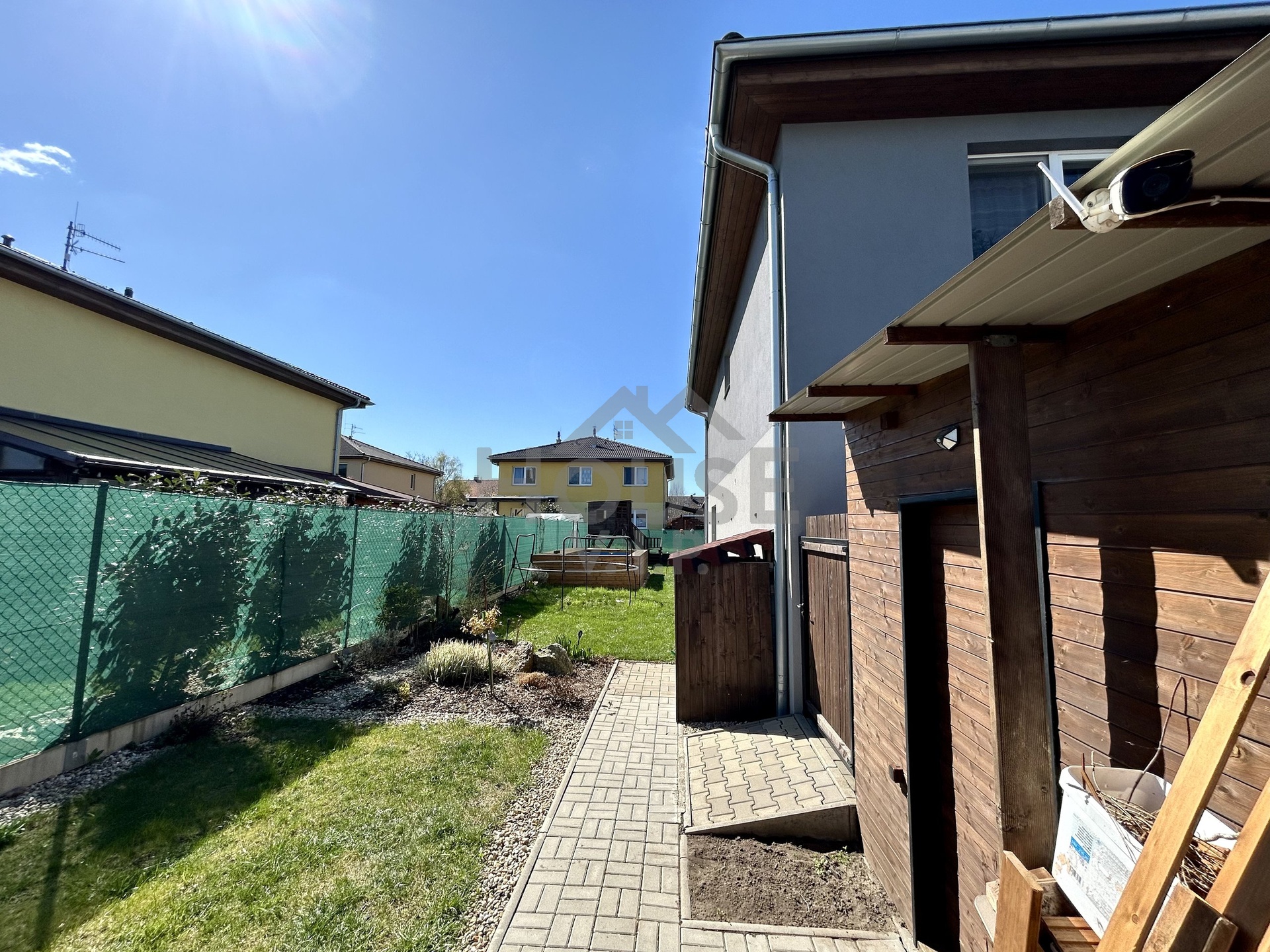 Součástí nemovitosti je soukromá zahrada o velikosti 260 m² s bazénem, terasou s pergolou (20 m²) a zahradním domkem (15 m²) vhodným na nářadí či kola.