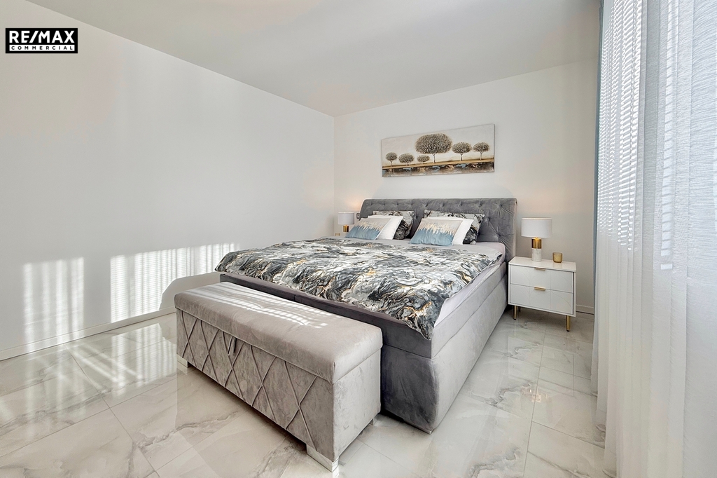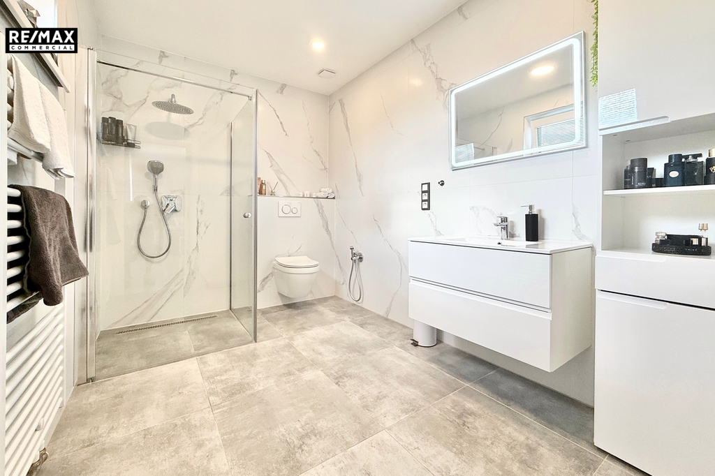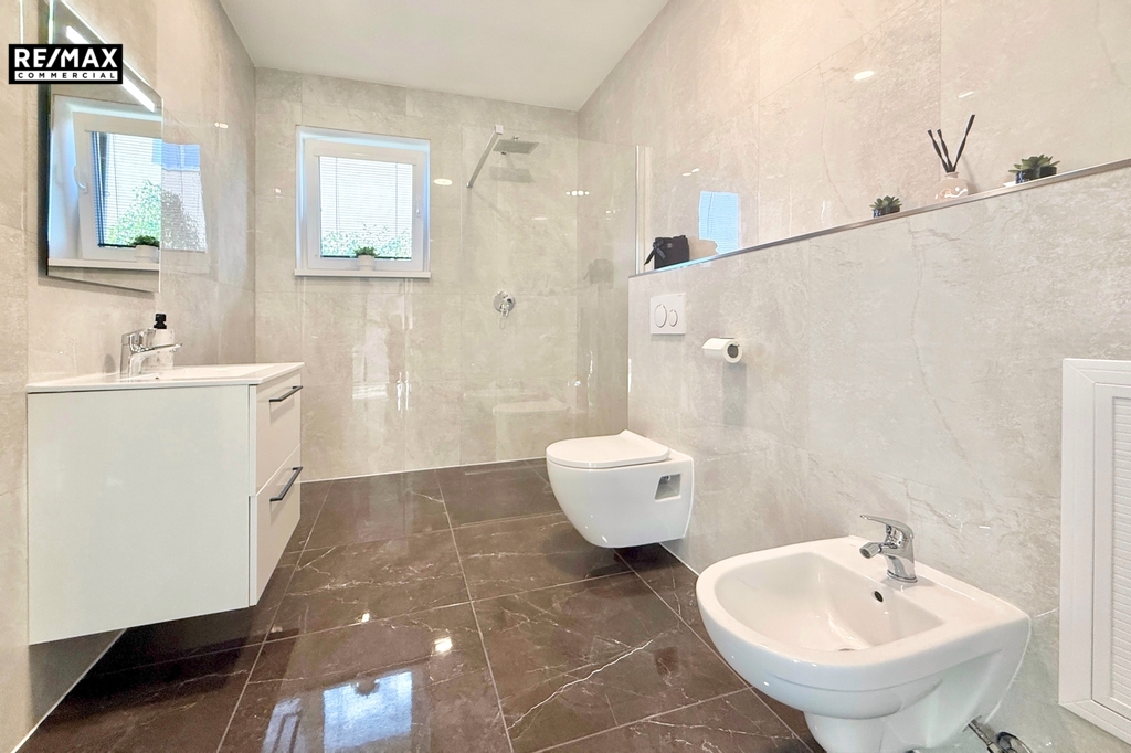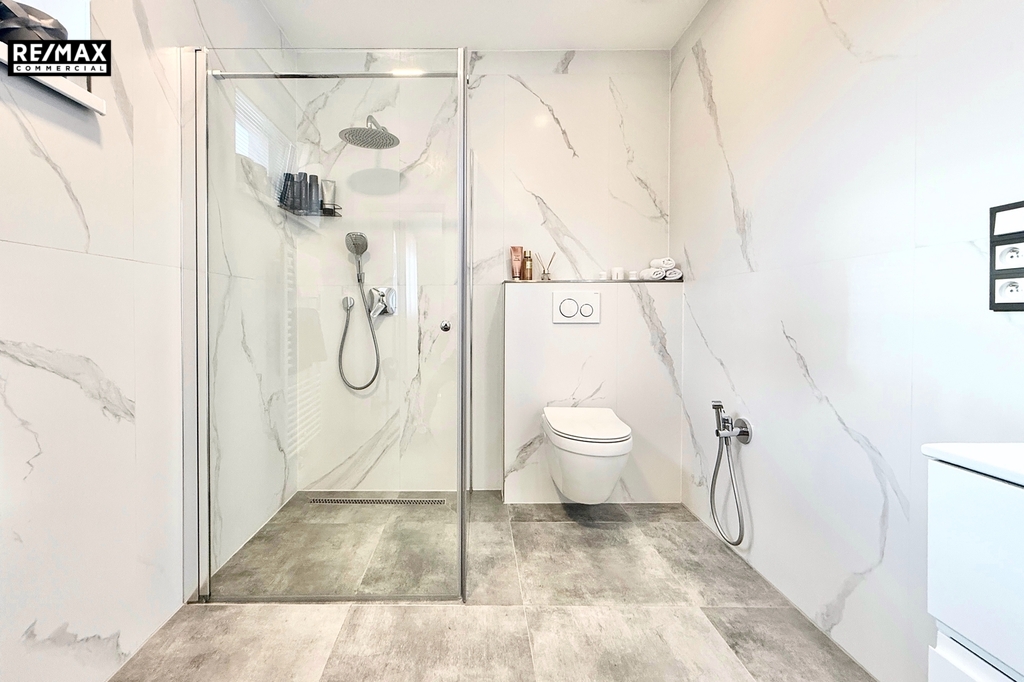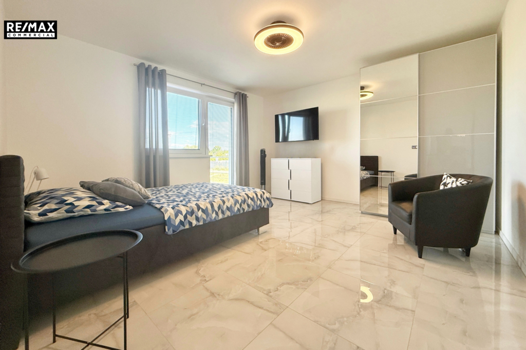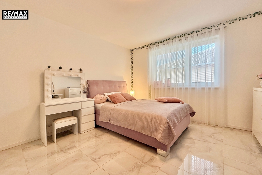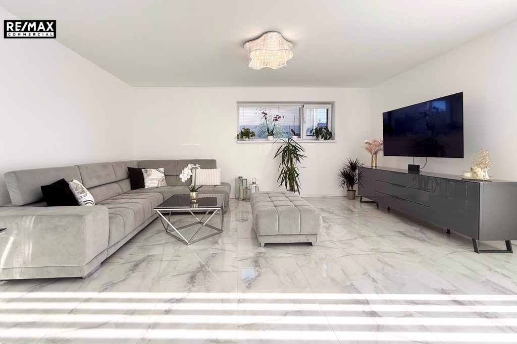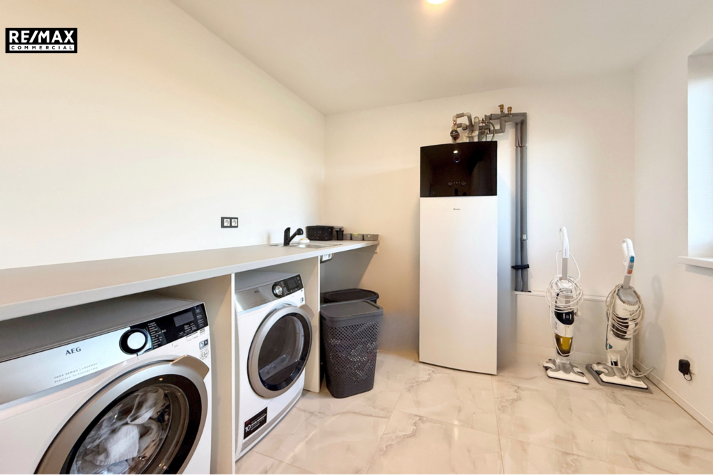 • Technické vybavení – tepelné čerpadlo a kvalitní zateplení znamenají nízké náklady na provoz. Kvalitní dlažba, sádrové omítky, bezfalcové dveře a značková kuchyň vytváří dojem luxusu.