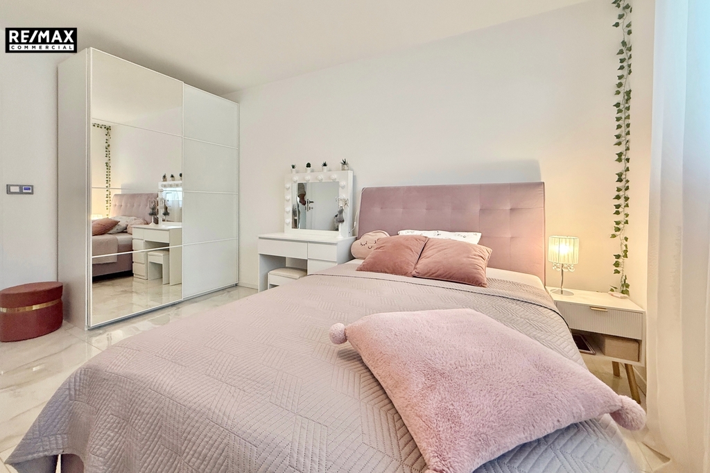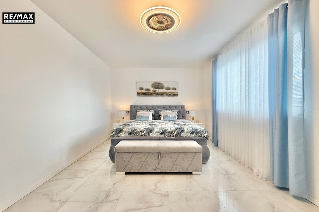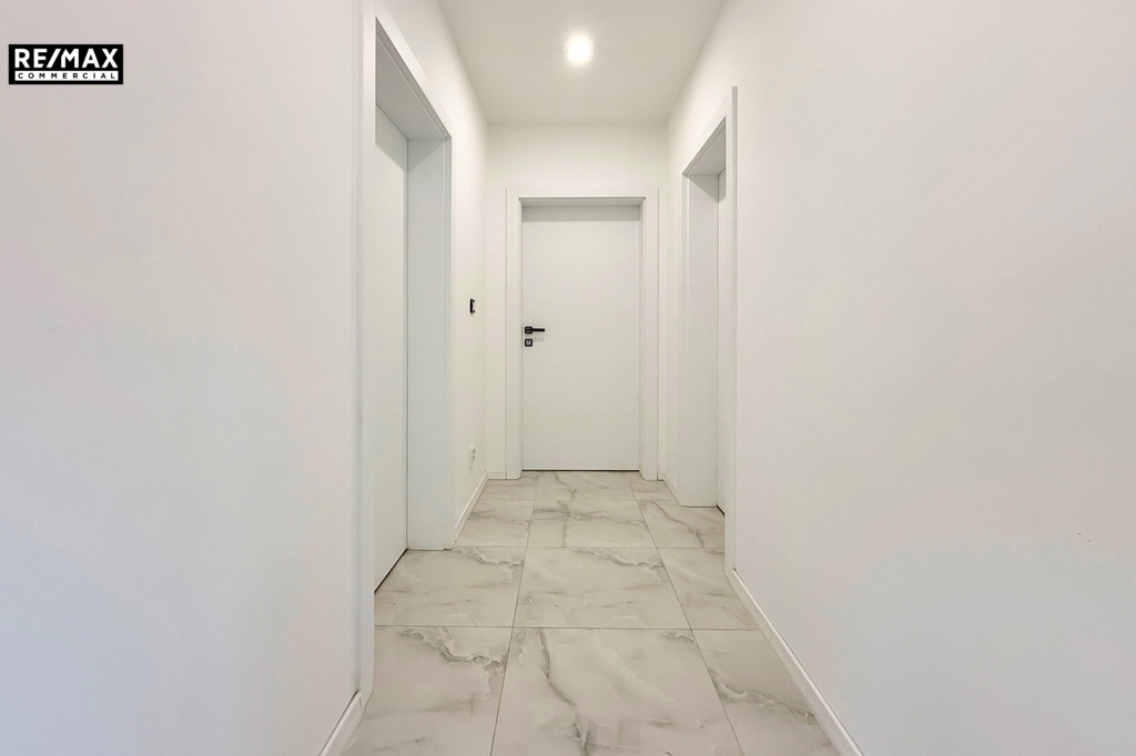 Vstup do domu je přes prostornou chodbu s vestavnou skříní. Ta navazuje na obývací pokoj s kuchyňským koutem o ploše 55,5 m² a vstupem na terasu orientovanou na západ. V přízemí se dále nachází koupelna se sprchou a garáž pro jedno auto s dálkově ovládanými vraty a s vnitřním vstupem z chodby. V patře je hlavní ložnice (23,8 m²) s vlastní šatnou a koupelnou se sprchou, dva samostatné pokoje (18,5 m² a 16,8 m²), přičemž jeden má přístup na soukromou terasu. K dispozici je také třetí koupelna s vanou a prostorná prádelna s technickým zázemím (14,2 m²), kterou lze využít jako čtvrtý obytný pokoj.