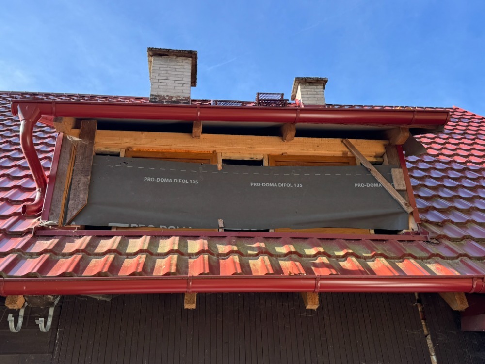 plechovými šablonami novějšího data. V oblasti vikýře je patrná započatá rekonstrukce provizorně