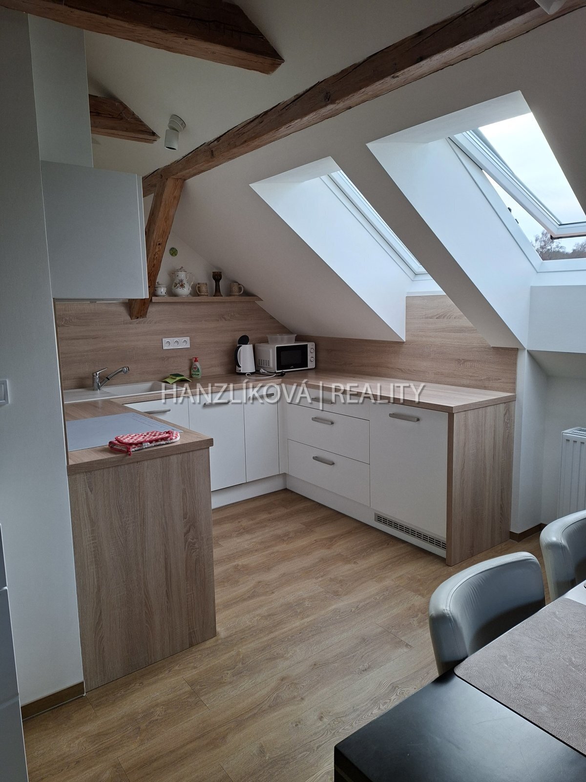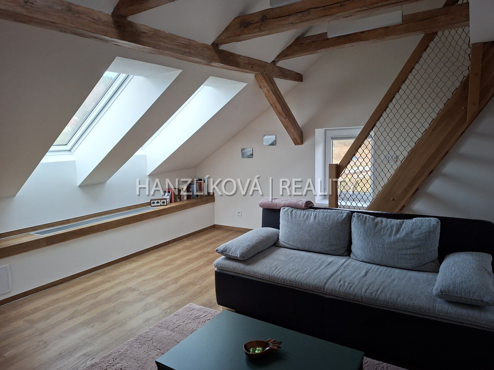 Byt je řešen jako 2+kk s velmi příjemnou atmosférou a dostatkem denního světla díky množství střešních oken.