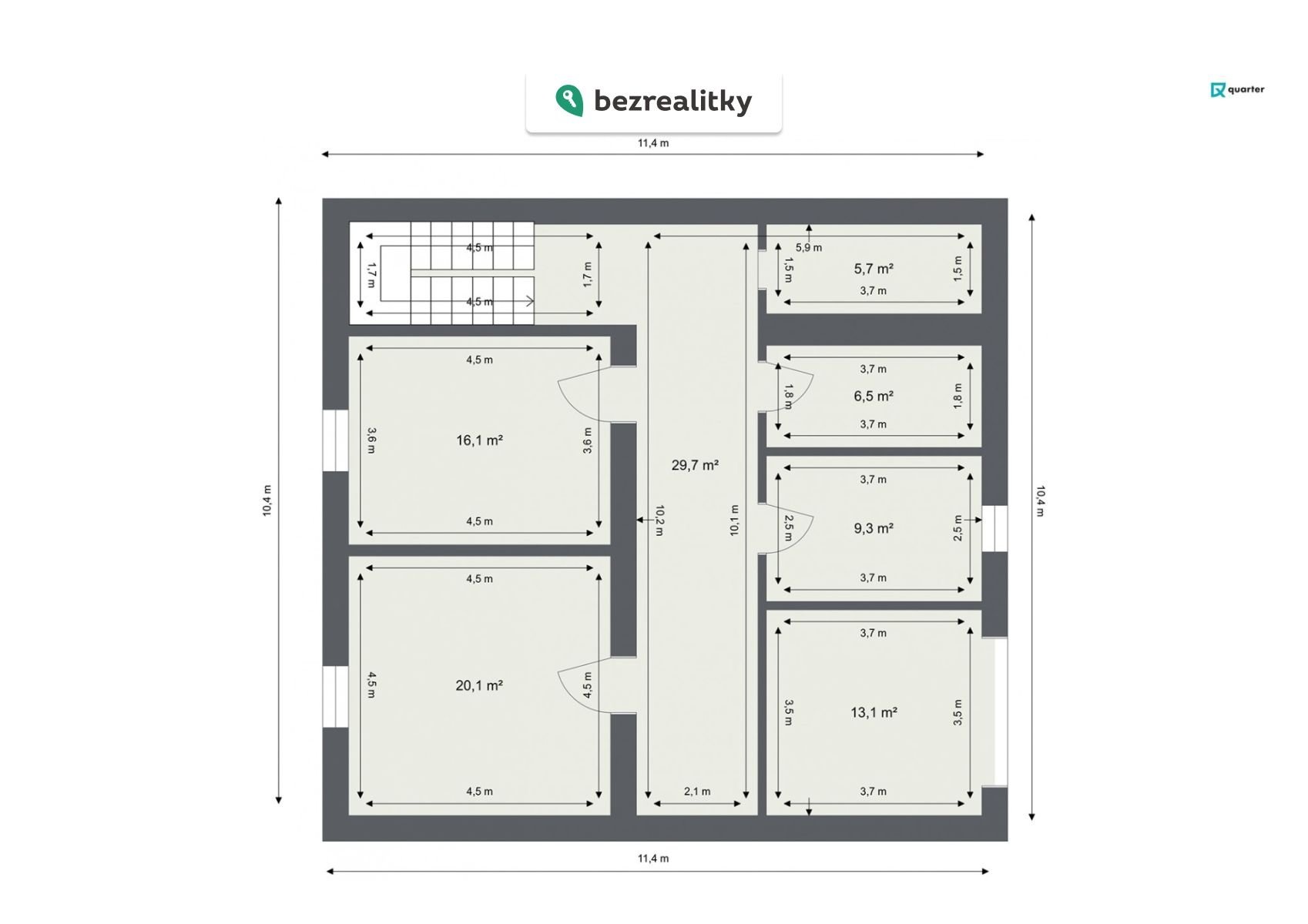 Přízemí (suterén): garáž (13,1 m2), pokoj (16,1 m2), pokoj (20,1 m2), kuchyň (9,3 m2), koupelna s toaletou (6,5 m2), prádelna (5,7 m2)