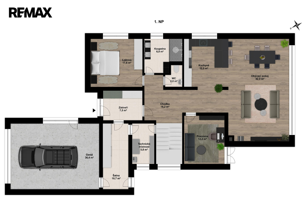 Výhodou je umístění domu v severní části pozemku, což zajistí, že jižní klidová zóna zůstane plně otevřena pro zahradu a venkovní relaxaci. Dům bude samostatně stojící, jednopodlažní, se sedlovou střechou a využitým podkrovím, což poskytuje ideální kombinaci komfortu a praktického využití prostoru.