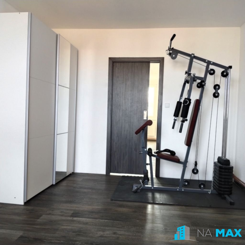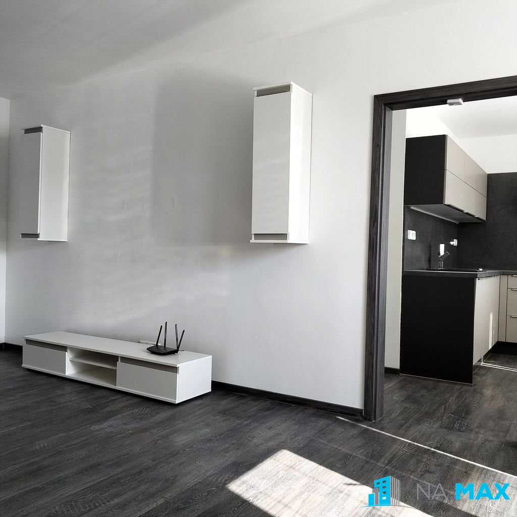 kuchyň - kuchyňská linka s varnou deskou, vestavnou troubou, myčkou a digestoří. V koupelně je k dispozici pračka a sušička, v obývacím pokoji zůstává stěna a v ložnici šatní skříň. Vytápění i ohřev vody zajišťuje elektrokotel.