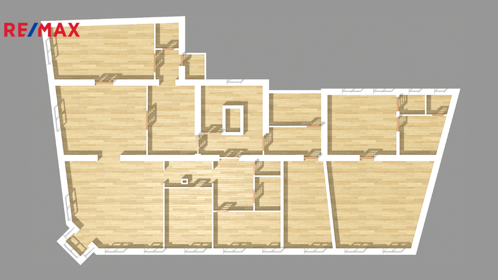 2.NP (280 m²) – Kanceláře rozdělené do samostatných místností se společnou chodbou a sociálním zařízením.
