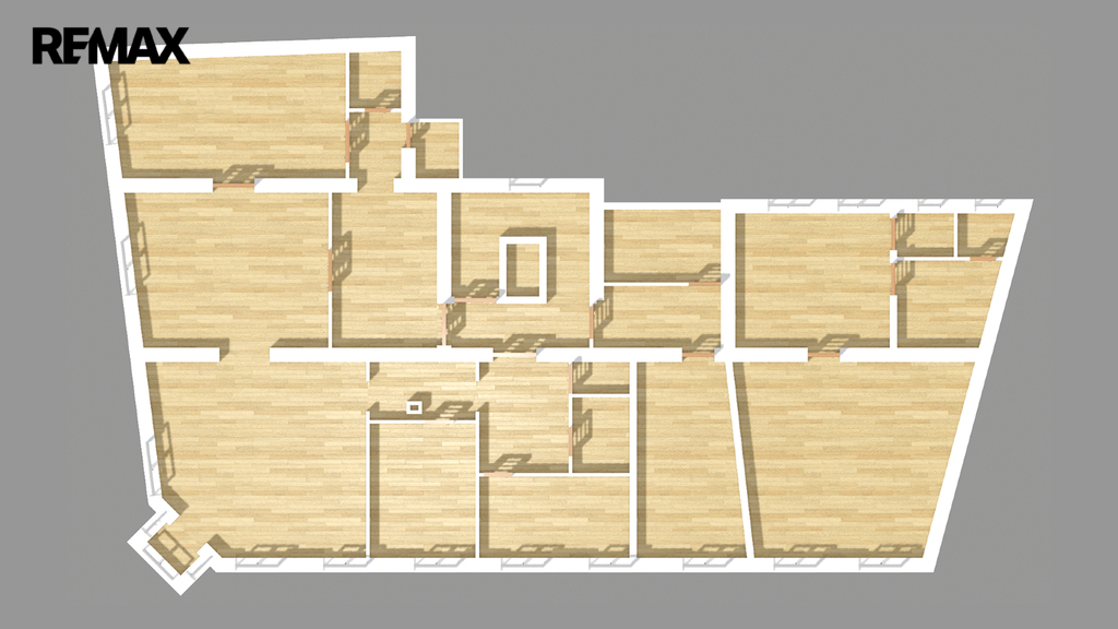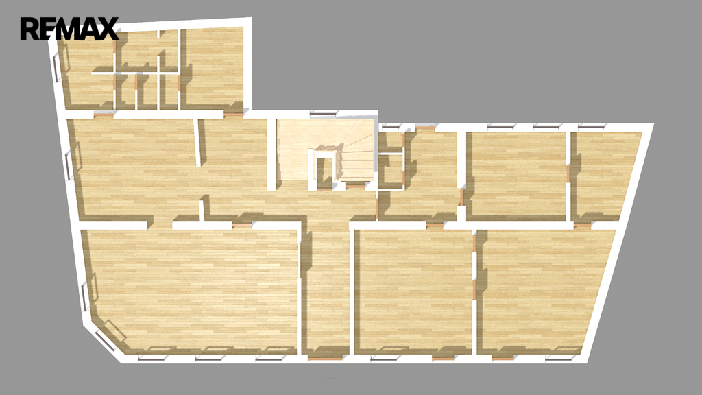 2.NP (280 m²) – Kanceláře rozdělené do samostatných místností se společnou chodbou a sociálním zařízením.