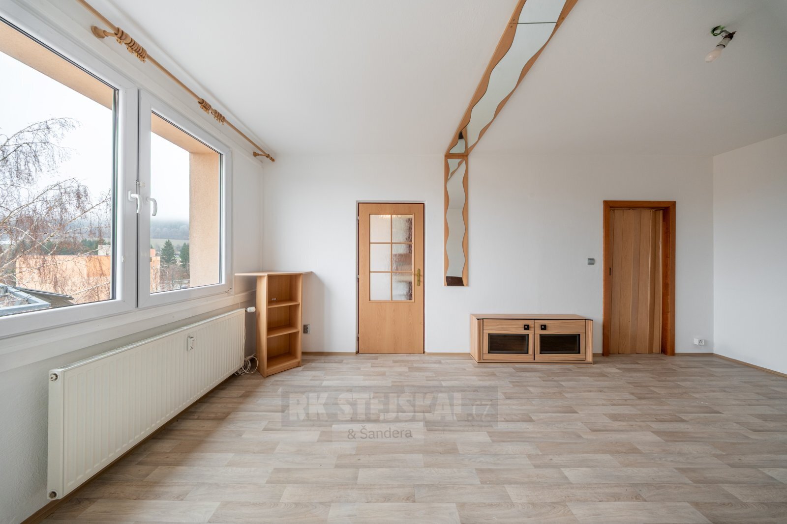 Dispozice: zádveří, chodba s šatními skříněmi, zděné bytové jádro, samostatná koupelna s menší vanou, umyvadlem a prostorem pro pračku, samostatné WC, velice prostorná, hlavní obytná místnost, samostatná kuchyň s linkou a s jídelním prostorem, všechna okna bytu s otevřeným výhledem, k bytu náleží sklepní kóje a možnost užívání všech společných prostor v domě.