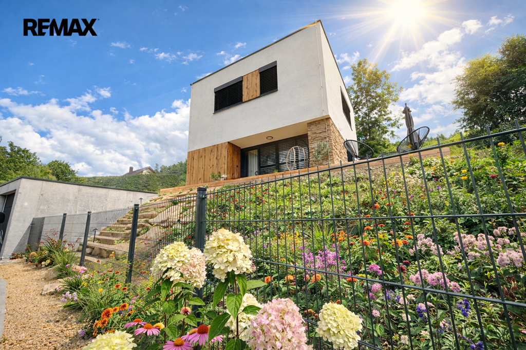 Exteriér domu vytváří harmonický dojem, který vás okouzlí svou pečlivě promyšlenou souhrou detailů - předzahrádka ozdobená okrasnou zelení, solitérním stromem, kameny i osvětlením. Betonová dlažba a pískované schody vytvářejí estetický vstup do domu. Žulová kostka u vjezdu na obecní park. stání u domu je odolná a nadčasová, stejně jako propustná betonová dlažba, která efektivně odvádí vodu. Svařovaný plot na bočních stranách a zadní části pozemku poskytne nejen soukromí, ale i bezpečí. Garáž je vybavená sekčními vraty a třífázovou zásuvkou , její kupní cena je 750.000,-Kč nad rámec kupní ceny domu.