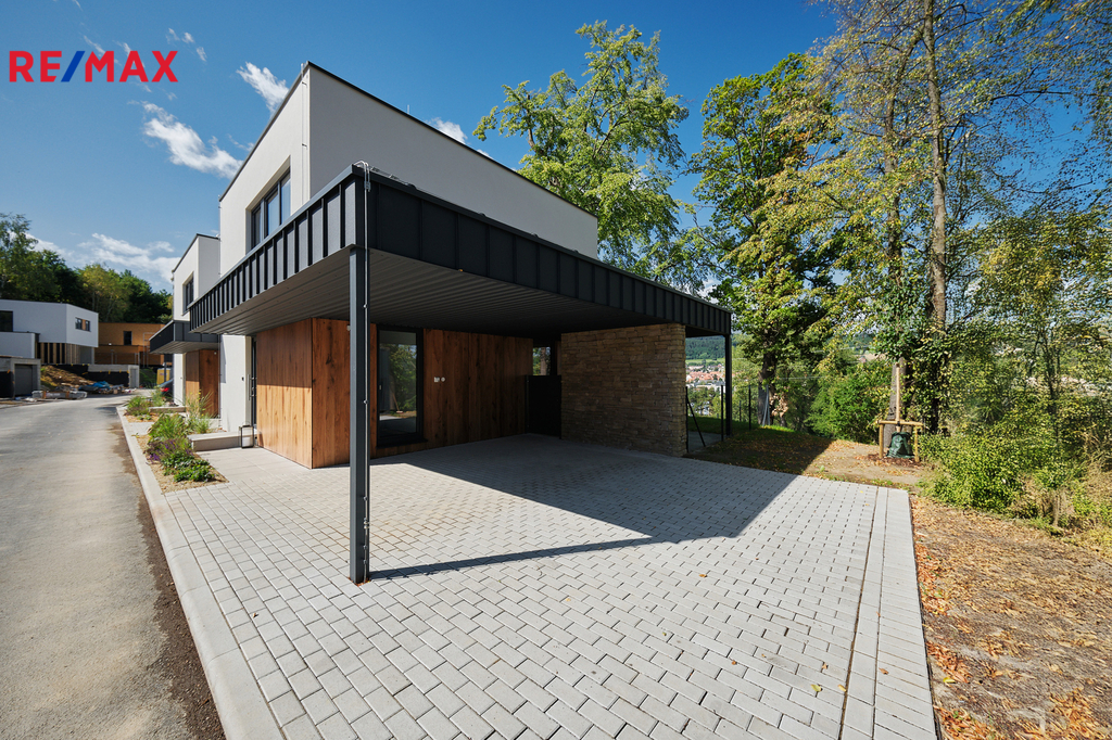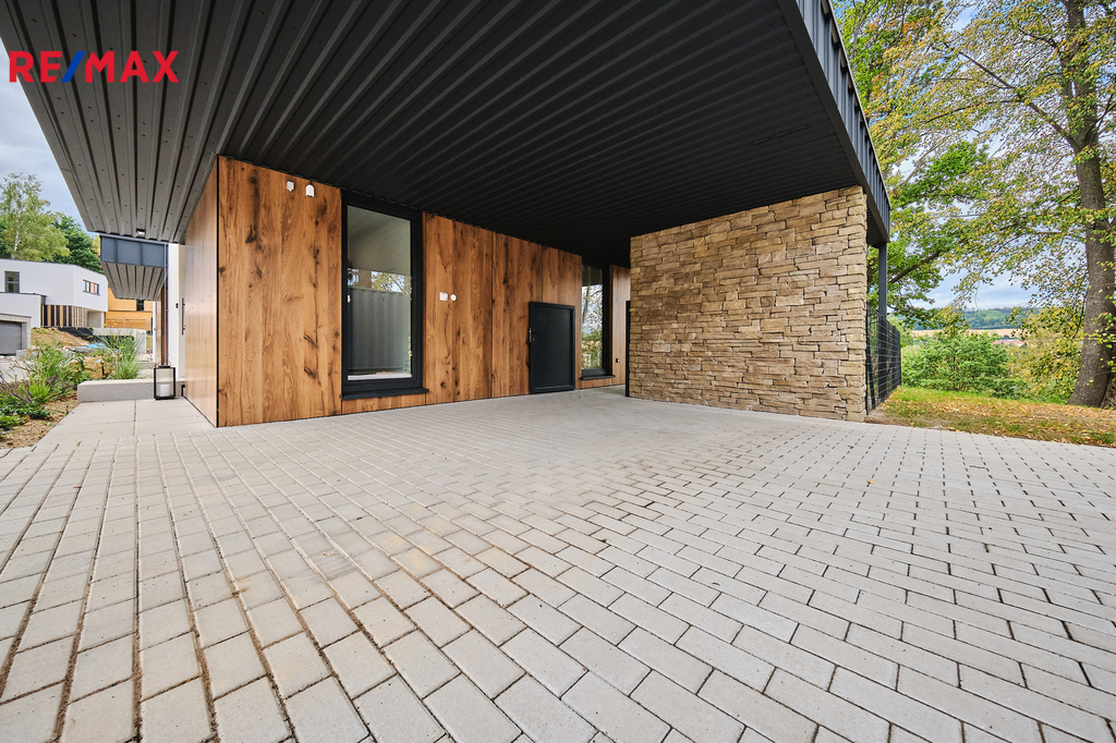 Vnější podoba domu přináší harmonii, která vás uchvátí svou pečlivou kombinací promyšlených detailů. Předzahrádka, zdobená okrasnými rostlinami, solitérním kamenem osvíceným soumraovým systémem, podtrhuje celkový estetický dojem. Obložená, podsvícená zeď kameny s dominantní plechovou brankou oddělující přední parkovací místo od zahrady přidává na atraktivitě. Jedno /ze dvou/ parkovacích stání je kryté a vybavené třífázovou zásuvkou. Krytá terasa má jihozápadní orientaci. Část pozemku za domem je rovná a dálepak se pozemek pozvolna svažuje. Svařovaný antracitový plot na pozemku poskytne nejen soukromí, ale i bezpečí.