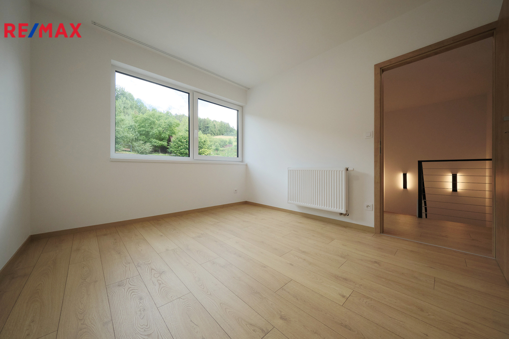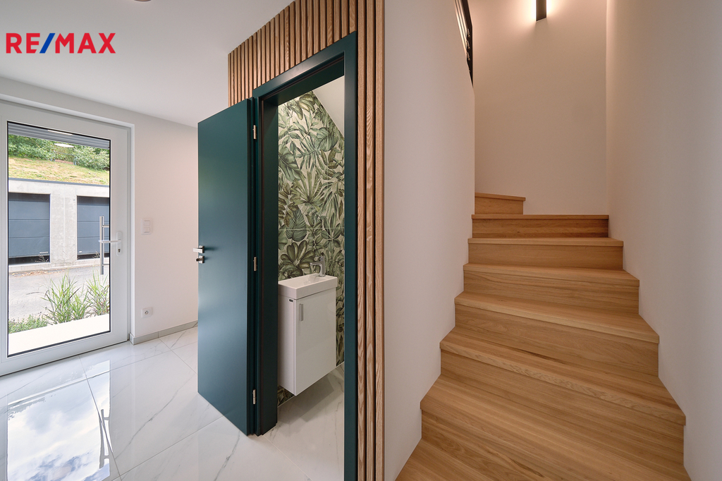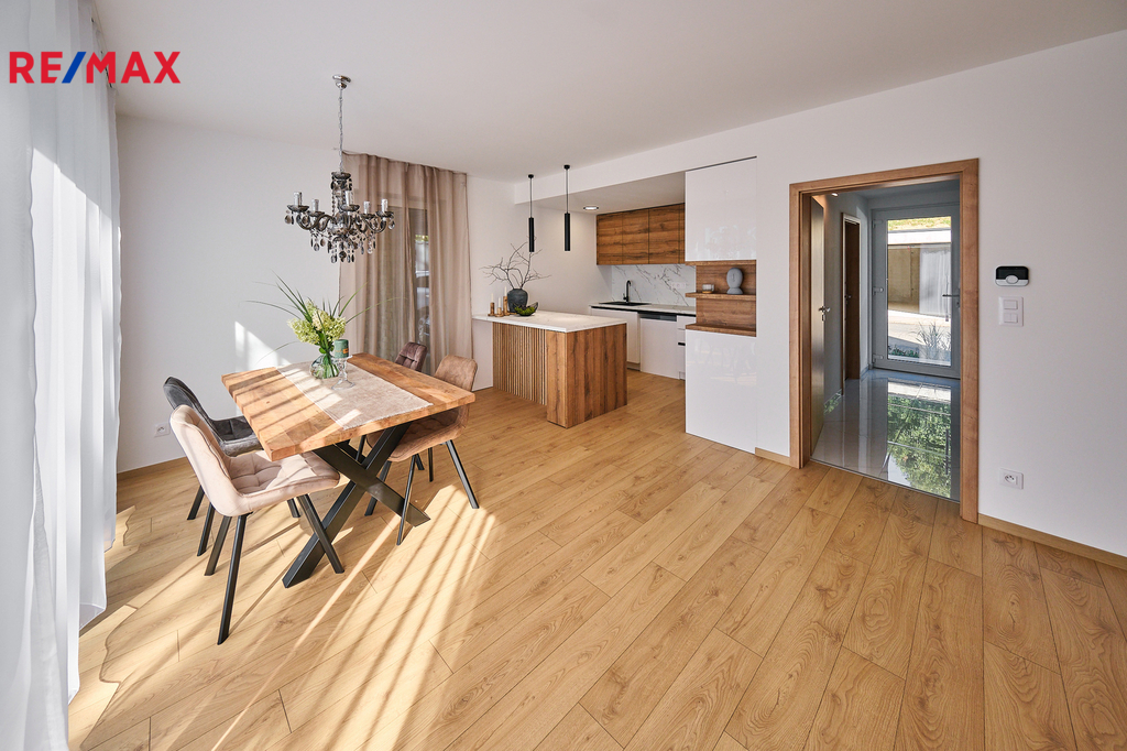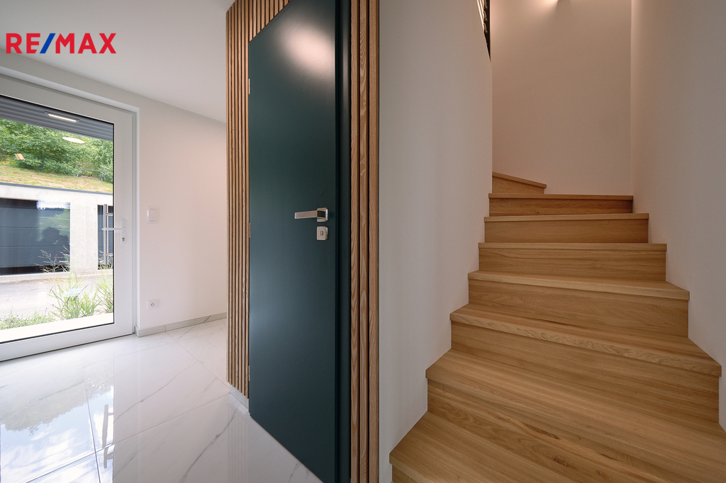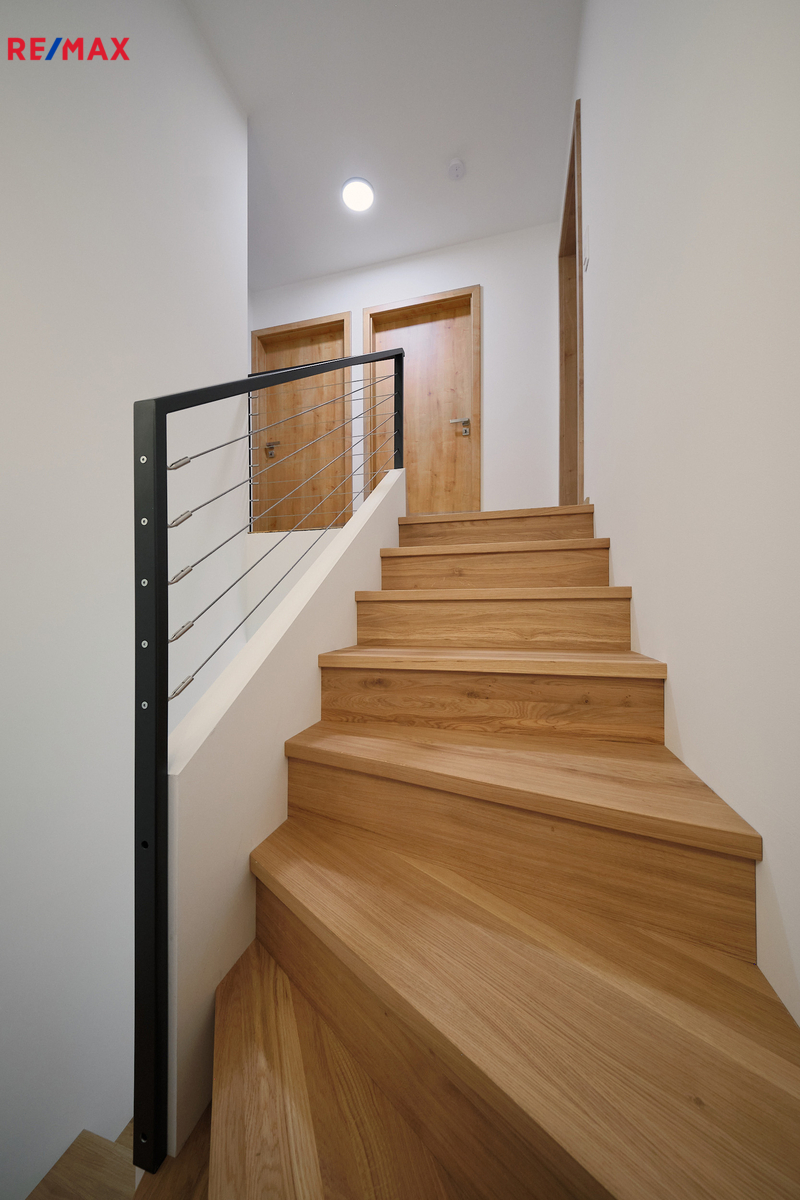 Při vstupu do domu vás okouzlí velké zrcadlo a dřevěná stěna v prostorné vstupní chodbě z níž vedou krásné dveře v zeleném dekoru na toaletu. Naproti je vstup do technické místnosti s kondenzačním kotlem a prostorem na pračku, sušičku. Prosvětlený obývací pokoj propojený s kuchyňským koutem a jídelnou nabízí vzdušný prostor pro rodinná setkání. Velká okna zajišťují dostatek denního světla a přímý vstup na zastřešenou terasu s nezaměnitelným výhledem na Prachatice. Jídelní kout je vybaven stolem z masivu, židlemi. Kuchyňská linka i ostrůvek je sladěn k celému interiéru. Dubové schodiště s kovovým zábradlím vás zavede do horního patra, které disponuje třemi neprůchozími pokoji z nichž je krásný výhled do zeleně. V patře se nachází i designová koupelna s vanou a toaletou. Skříňka i podsvětlené kulaté zrcadlo je součástí vybavení. V celém domě je použita kvalitní laminátová podlaha nebo velkoformátová dlažba, zabudované kolejnice na záclony a závěsy a designové osvětlení.