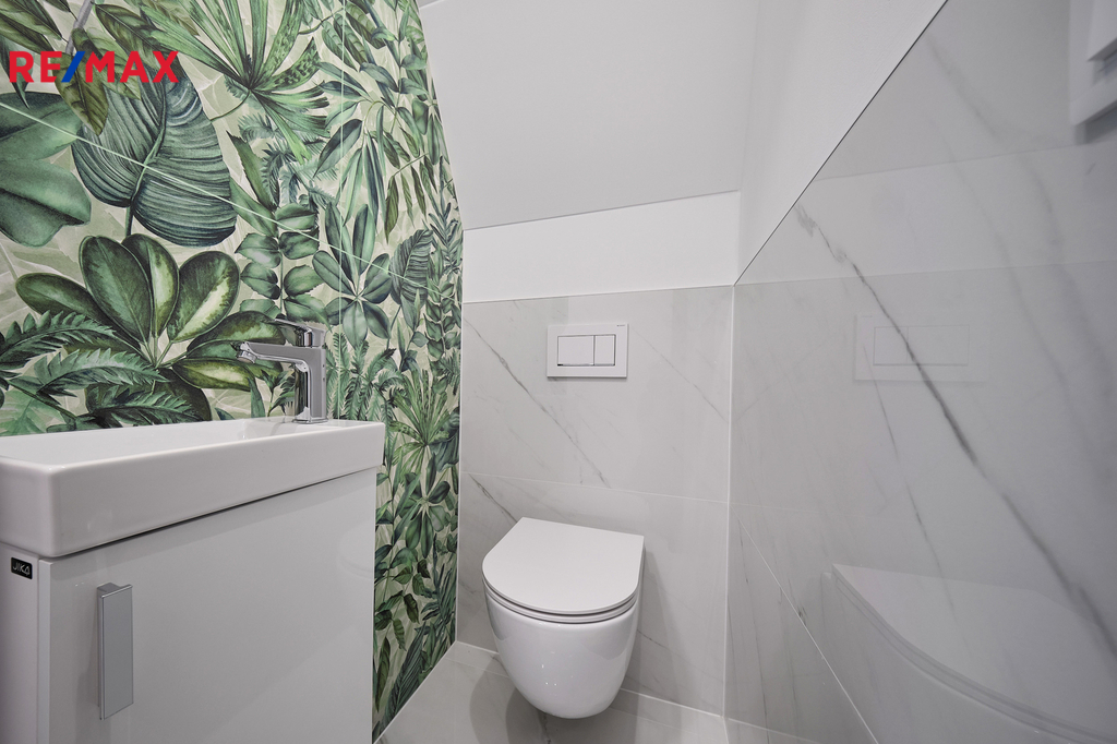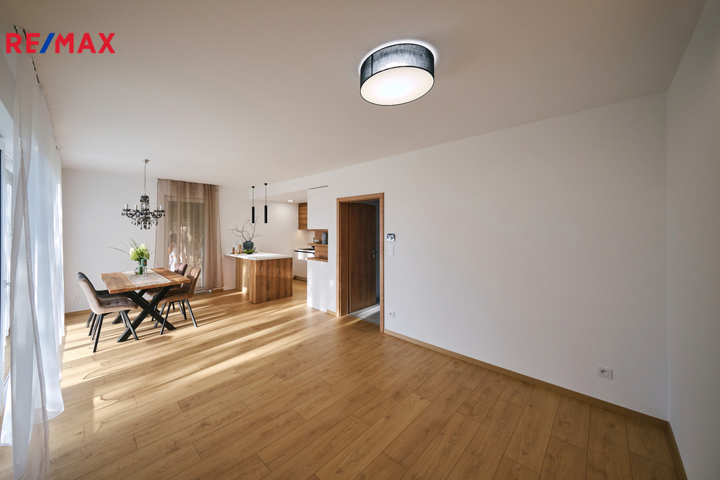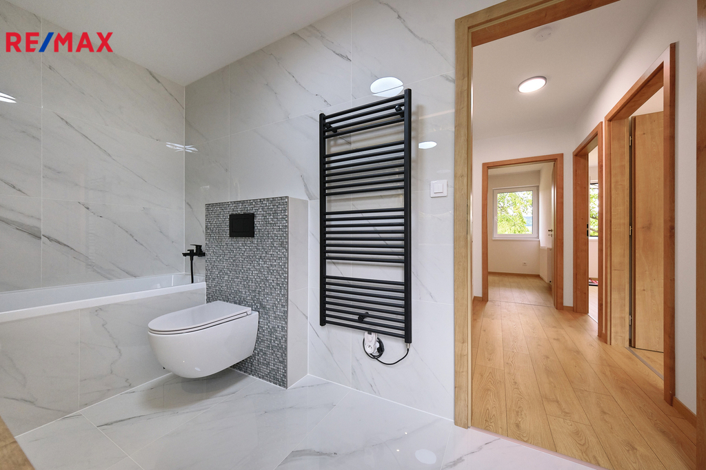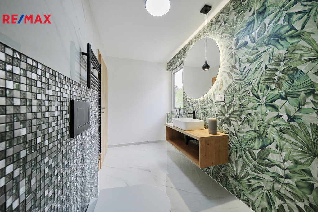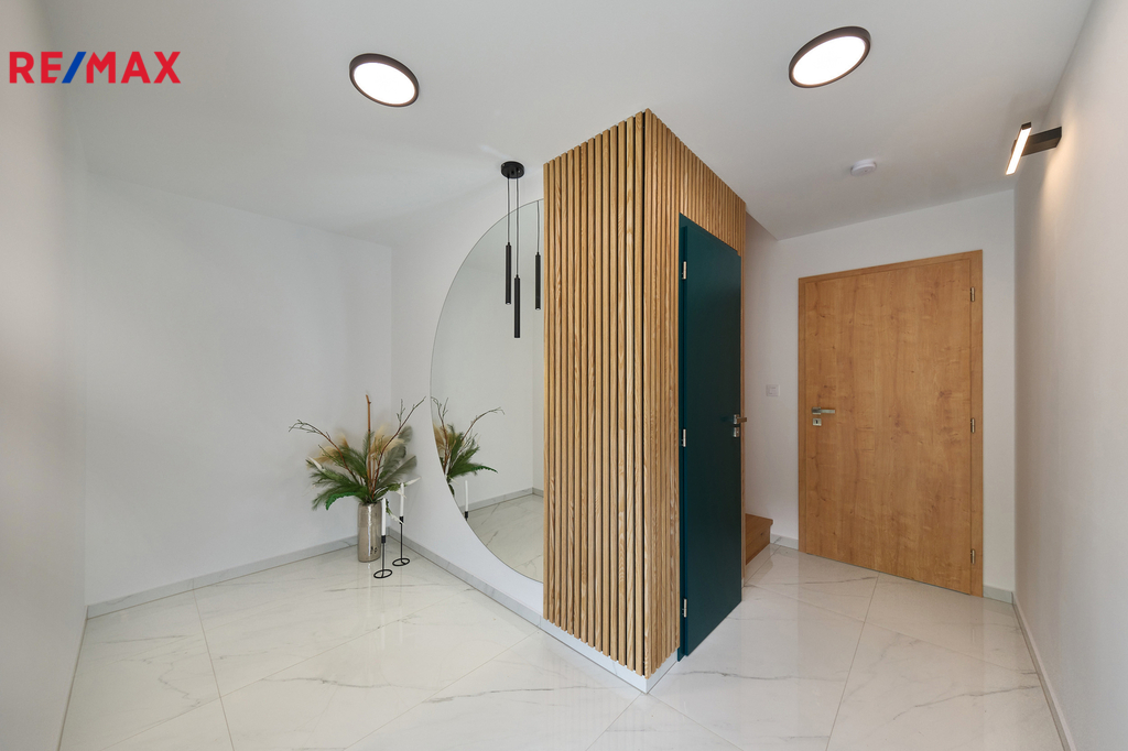 Při vstupu do domu vás okouzlí velké zrcadlo a dřevěná stěna v prostorné vstupní chodbě z níž vedou krásné dveře v zeleném dekoru na toaletu. Naproti je vstup do technické místnosti s kondenzačním kotlem a prostorem na pračku, sušičku. Prosvětlený obývací pokoj propojený s kuchyňským koutem a jídelnou nabízí vzdušný prostor pro rodinná setkání. Velká okna zajišťují dostatek denního světla a přímý vstup na zastřešenou terasu s nezaměnitelným výhledem na Prachatice. Jídelní kout je vybaven stolem z masivu, židlemi. Kuchyňská linka i ostrůvek je sladěn k celému interiéru. Dubové schodiště s kovovým zábradlím vás zavede do horního patra, které disponuje třemi neprůchozími pokoji z nichž je krásný výhled do zeleně. V patře se nachází i designová koupelna s vanou a toaletou. Skříňka i podsvětlené kulaté zrcadlo je součástí vybavení. V celém domě je použita kvalitní laminátová podlaha nebo velkoformátová dlažba, zabudované kolejnice na záclony a závěsy a designové osvětlení.