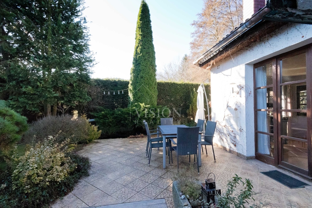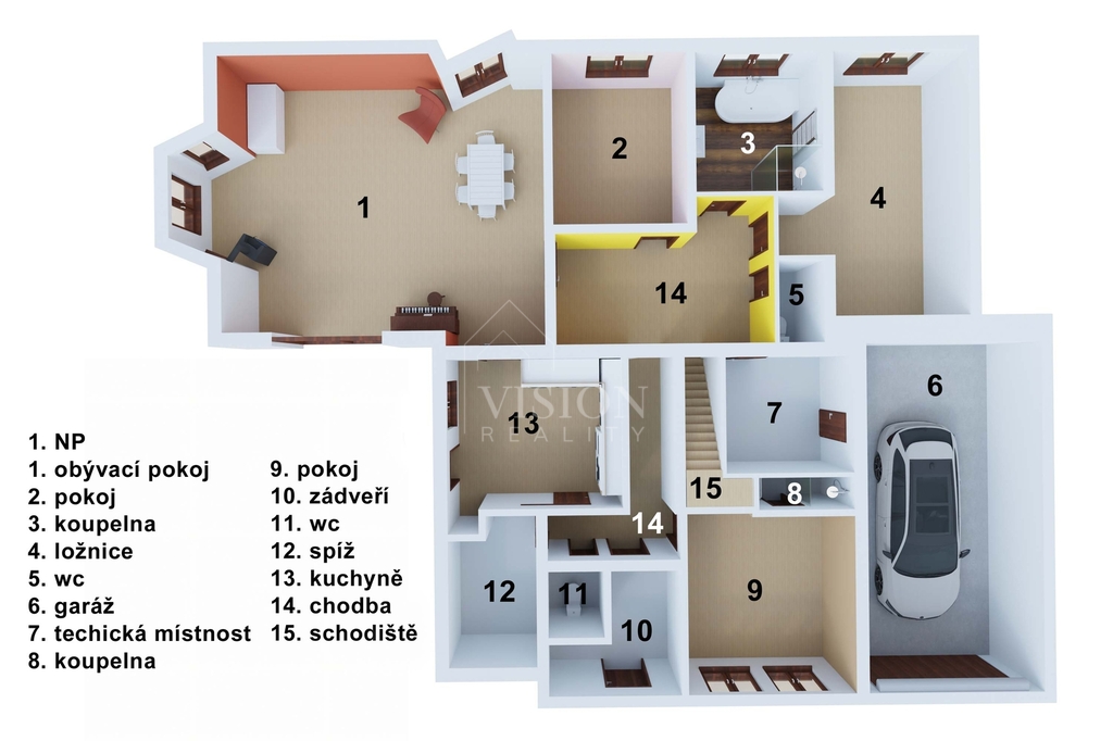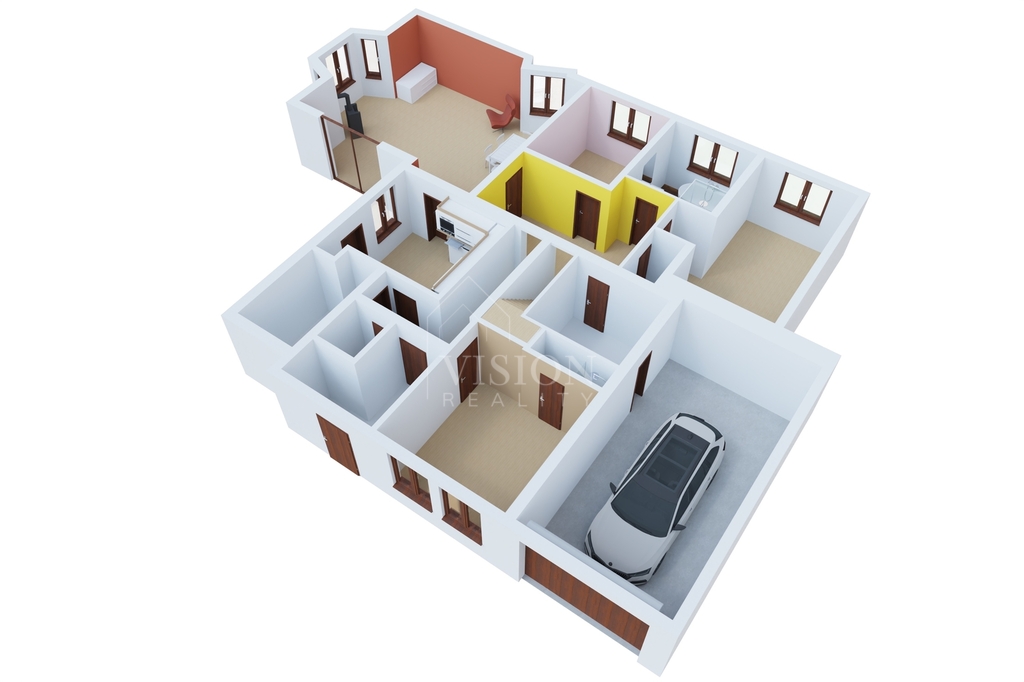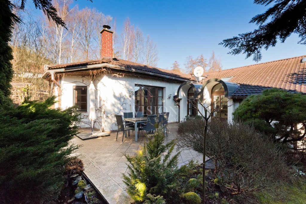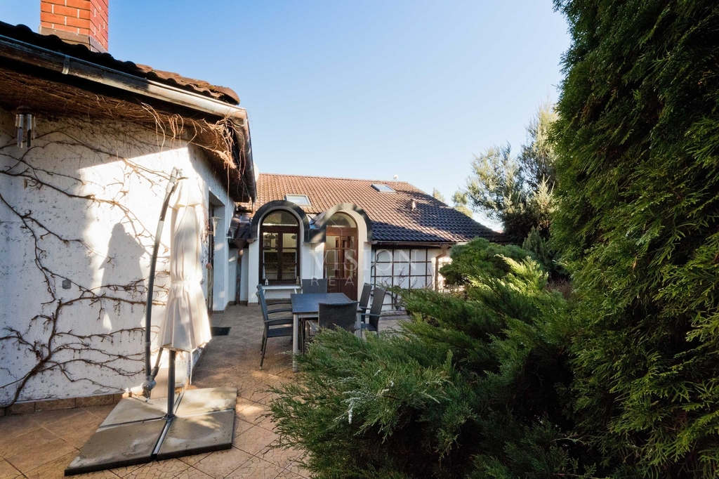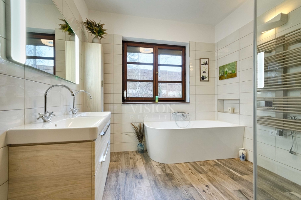 Dům je dispozičně řešený jako 6+1 o podlahové ploše 198 m2, s navazující garáží, terasou a zahradou, která má výměru 566 m2.