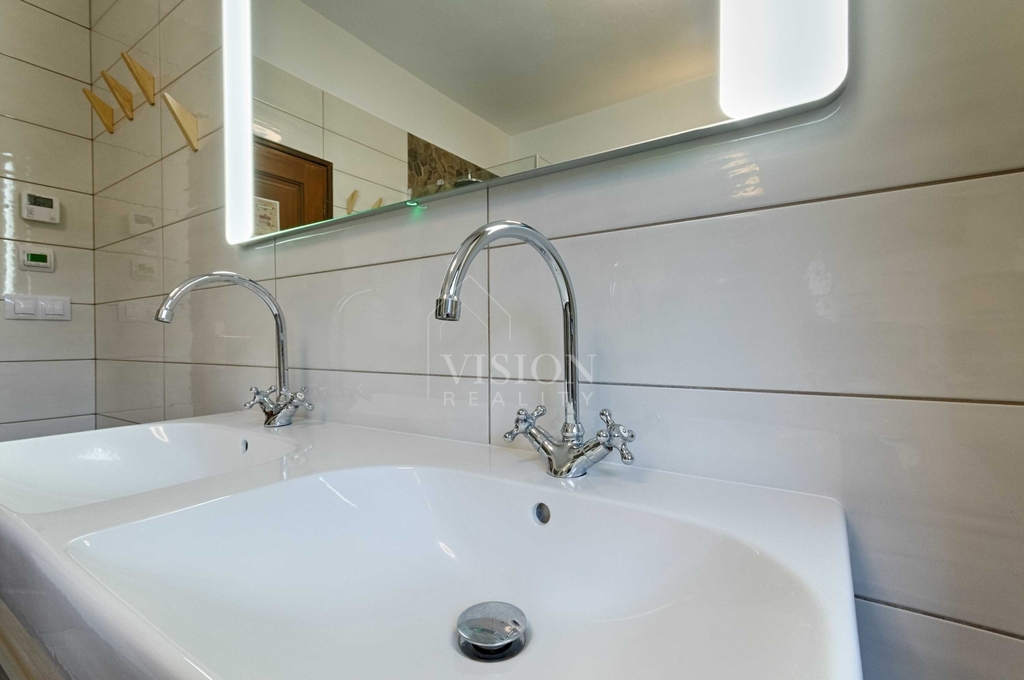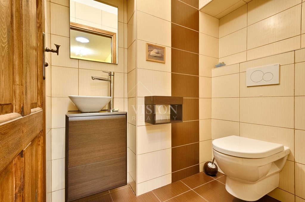 V přízemí se nachází prostorný obývací pokoj, vybavený krbem, zároveň navazující na kuchyni, která je vybavena vestavěnými spotřebiči a velkou spižírnou. Dále se v přízemí nachází ložnice s vlastní koupelnou a další dva pokoje, dále pak prostorná koupelna se sprchou i vanou, dvě samostatné toalety a technická místnost.