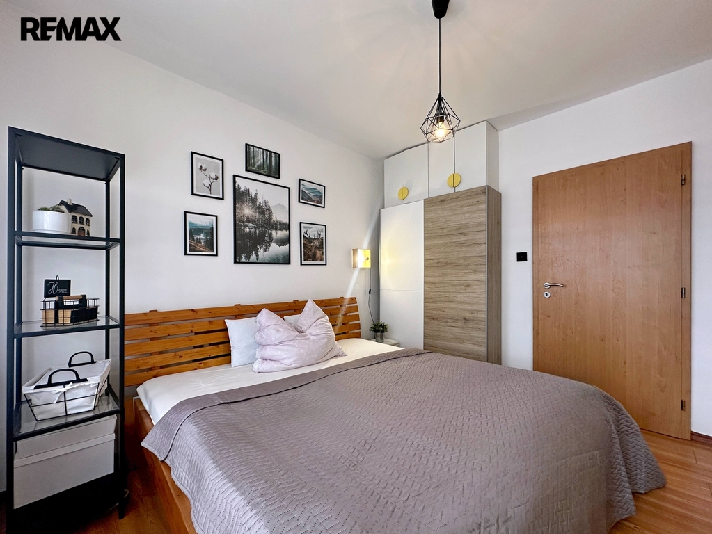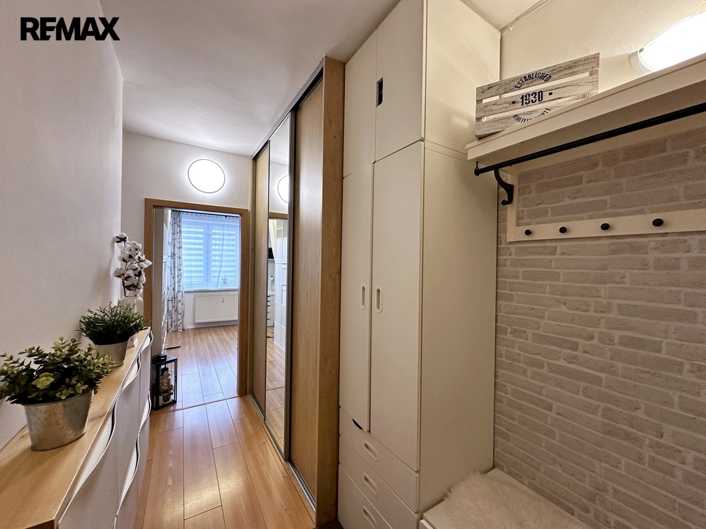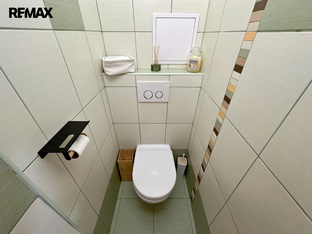 Dispozice zahrnuje samostatnou koupelnu a toaletu, přičemž výhodou jsou také vestavné skříně v předsíni i ložnici. Byt se prodává včetně vybavení, jehož součástí je i kuchyňská linka s novými chytrými spotřebiči. Vstup do bytu je zabezpečen protipožárními dveřmi.