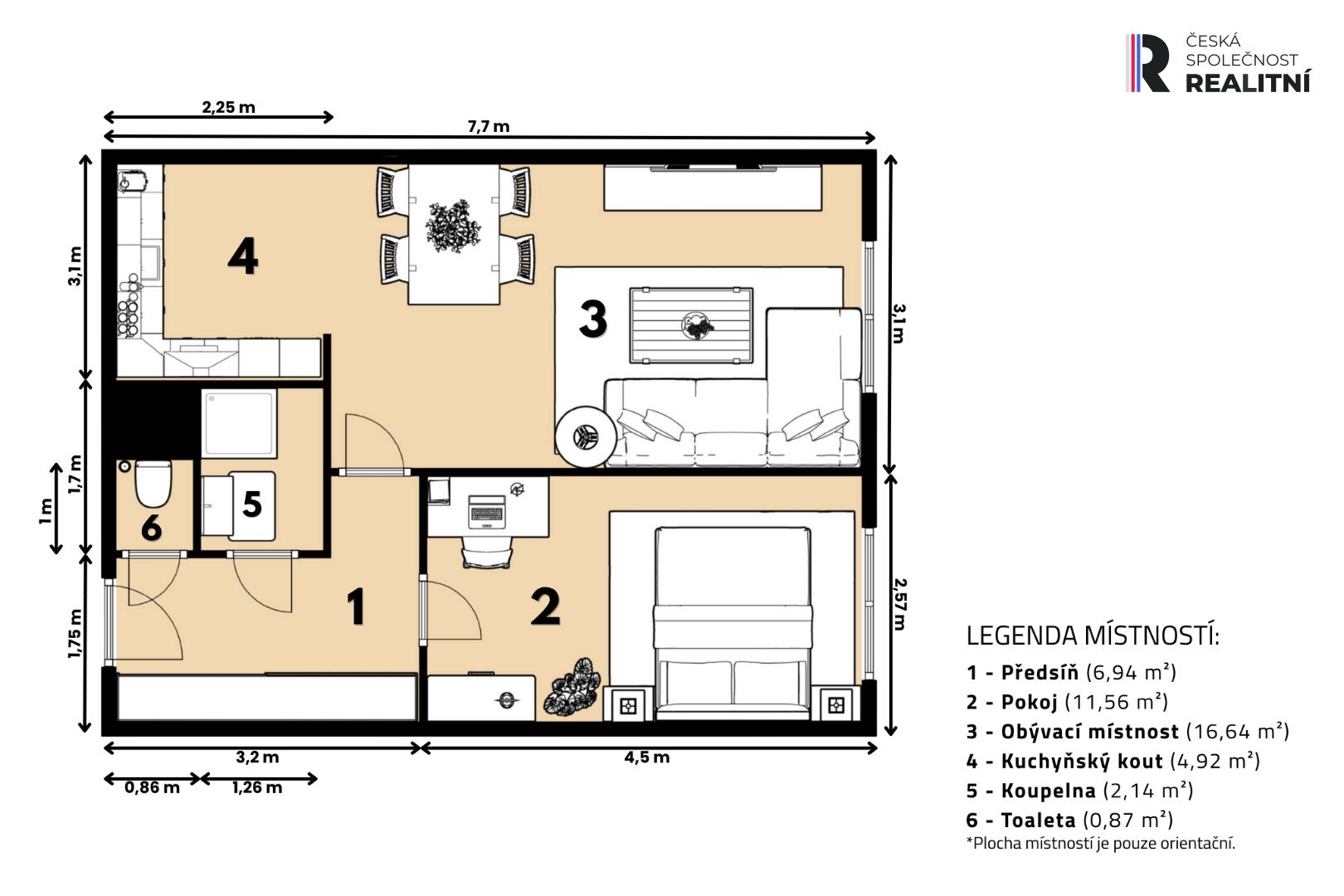 | Dispozice/podlahová plocha: | 2+kk/44 m² |