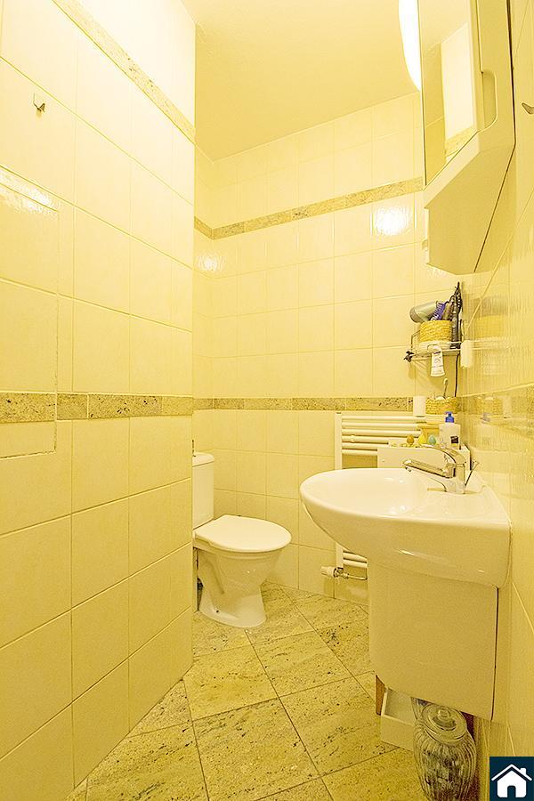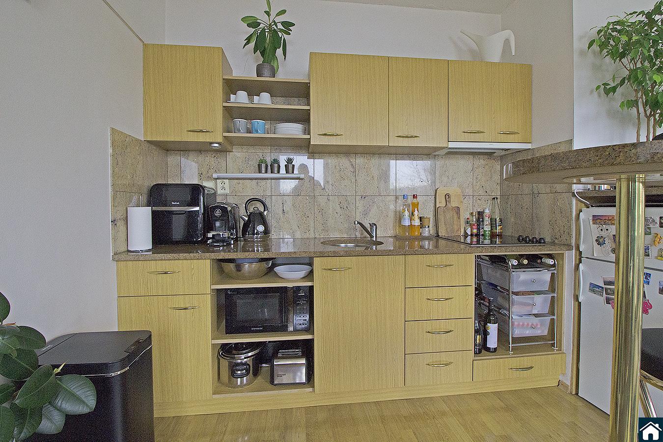 Byt je vybavený kuchyňskou linkou se sporákem se sklokeramickou deskou, lednicí a barovým pultem. Koupelna je se sprchovým koutem a WC je společné. Komora v bytě a sklep řeší úložný prostor.