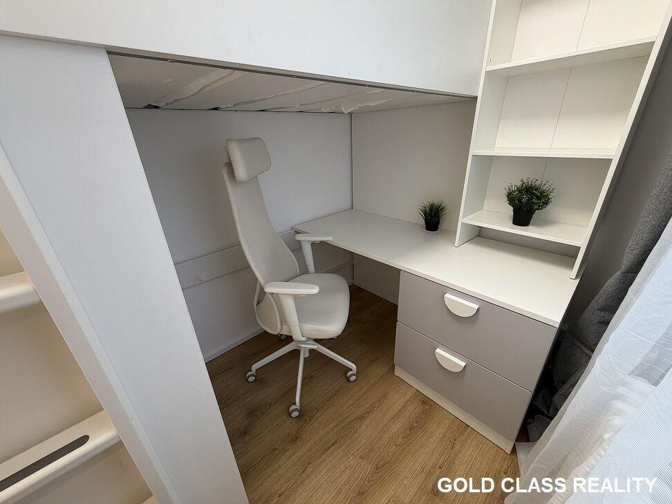 Jednotka je tvořena malou předsíňkou s moderně vybavenou kuchyní na míru vč. vestavěných spotřebičů zahrnujících mikrovlnnou troubu i ledničku a indukční varnou deskou na vaření (2m2), odděleným WC (1m2) a slunnou místností s velkým oknem a volným výhledem (5m2). Úložný prostor je důmyslně řešen závěsnými skříňkami na míru. Obývací část je zařízena skříní, vysokou postelí, velkým stolem, kvalitní kancelářskou židlí a knihovnou. V jednotce ani budově není možnost sprchy / vany, nutno řešit separátně (např. v blízkém saunovém světě, plaveckém areálu Jedenáctka, či na svém pracovišti / sportovišti).