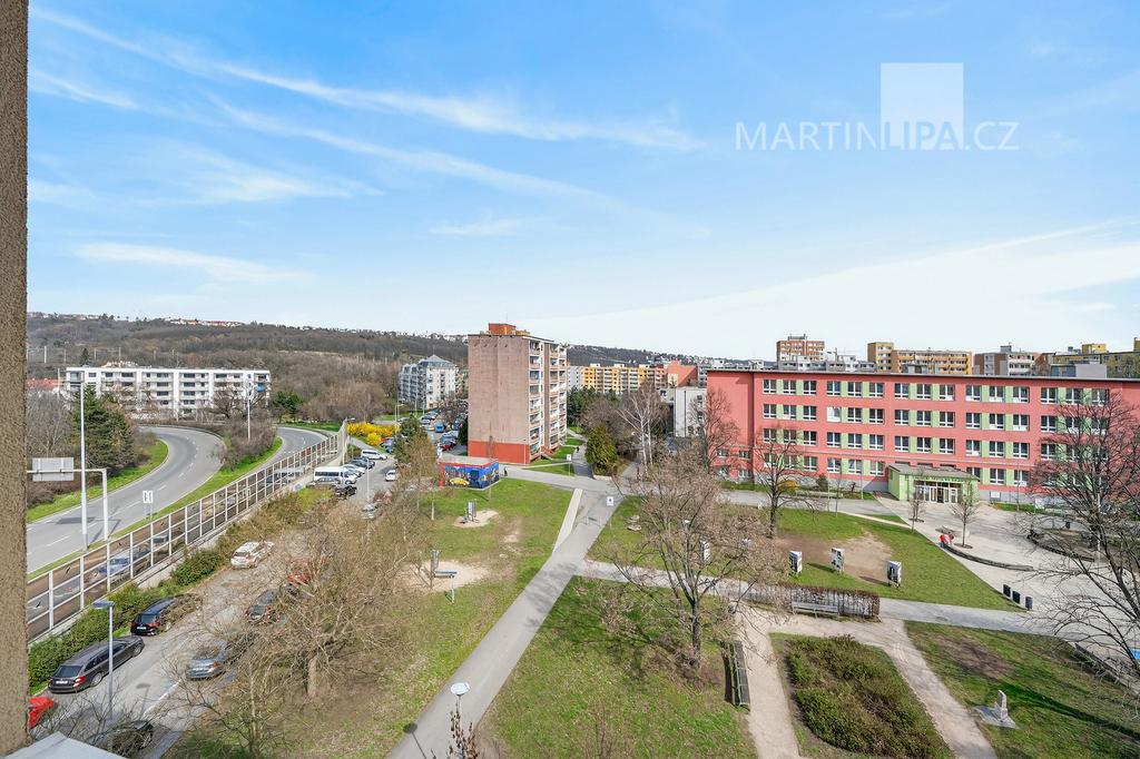 A právě okolí je na tomhle bytě další silná karta. Hned před domem máte náměstí s lavičkami, hřišti a školou. Minutku od vchodu je tramvaj a výborně dostupné je i metro B — ať už Českomoravská, nebo Palmovka. Na Sokolovské máte obchody, služby a vůbec všechno. A když budete chtít trochu vypnout, park Podvinní je odsud opravdu kousek. Je to přesně ten typ lokality, která spojuje městskou praktičnost s možností normálně fungovat i mimo byt.