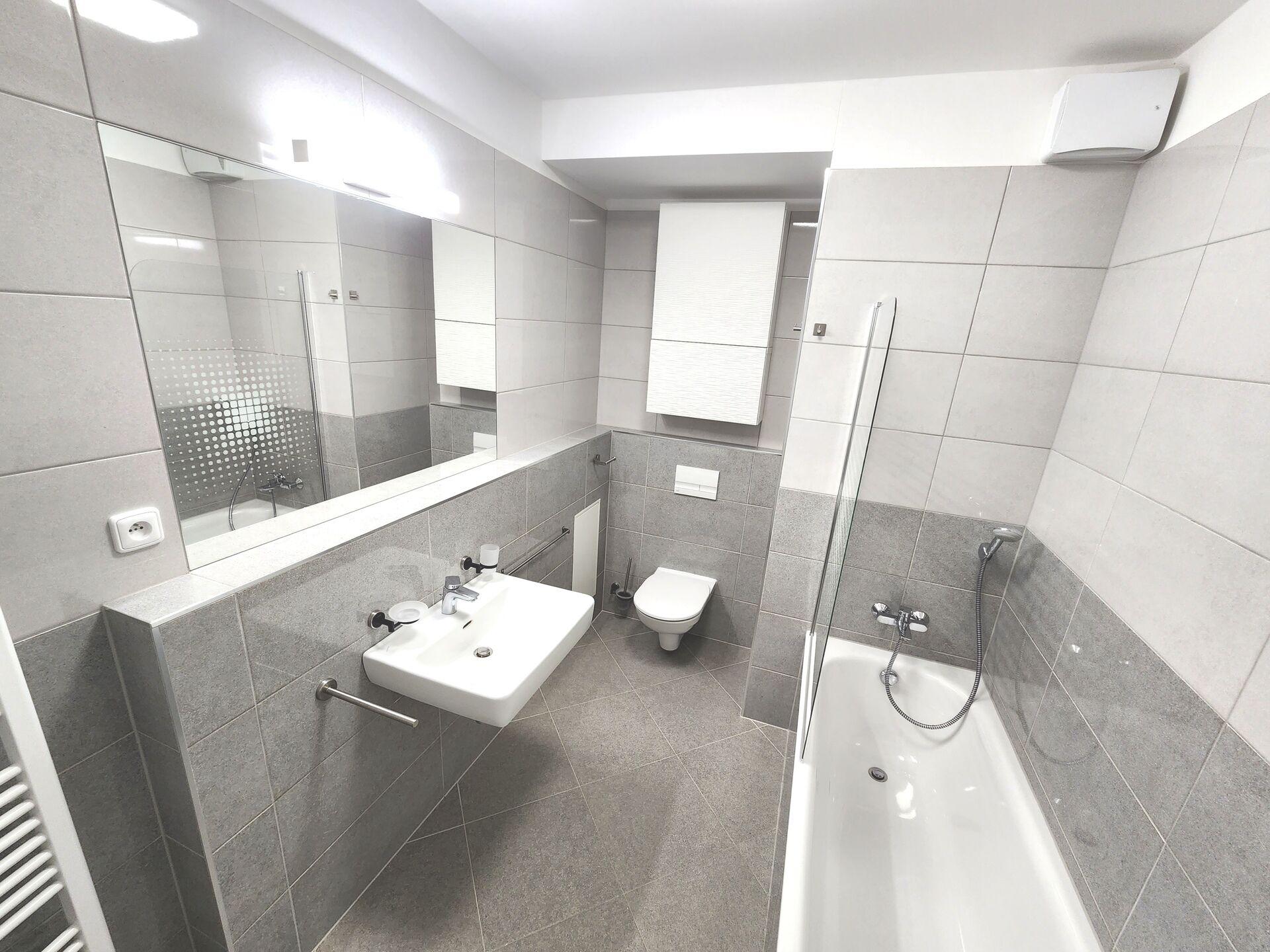Koupelna s umyvadlem, koupelnovými doplňky, zrcadlem a vanou se skleněnou vanovou zástěnou, závěsné WC, včetně pračky.