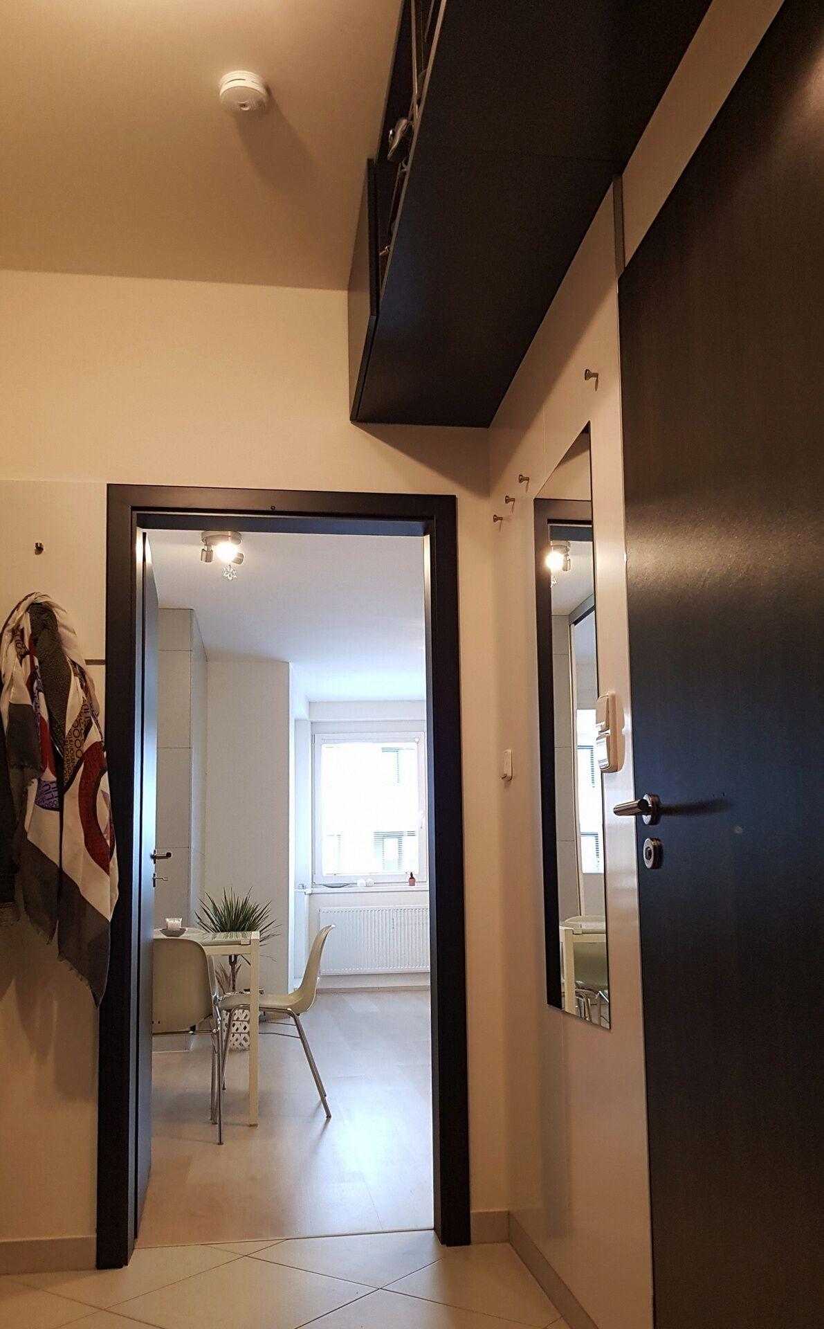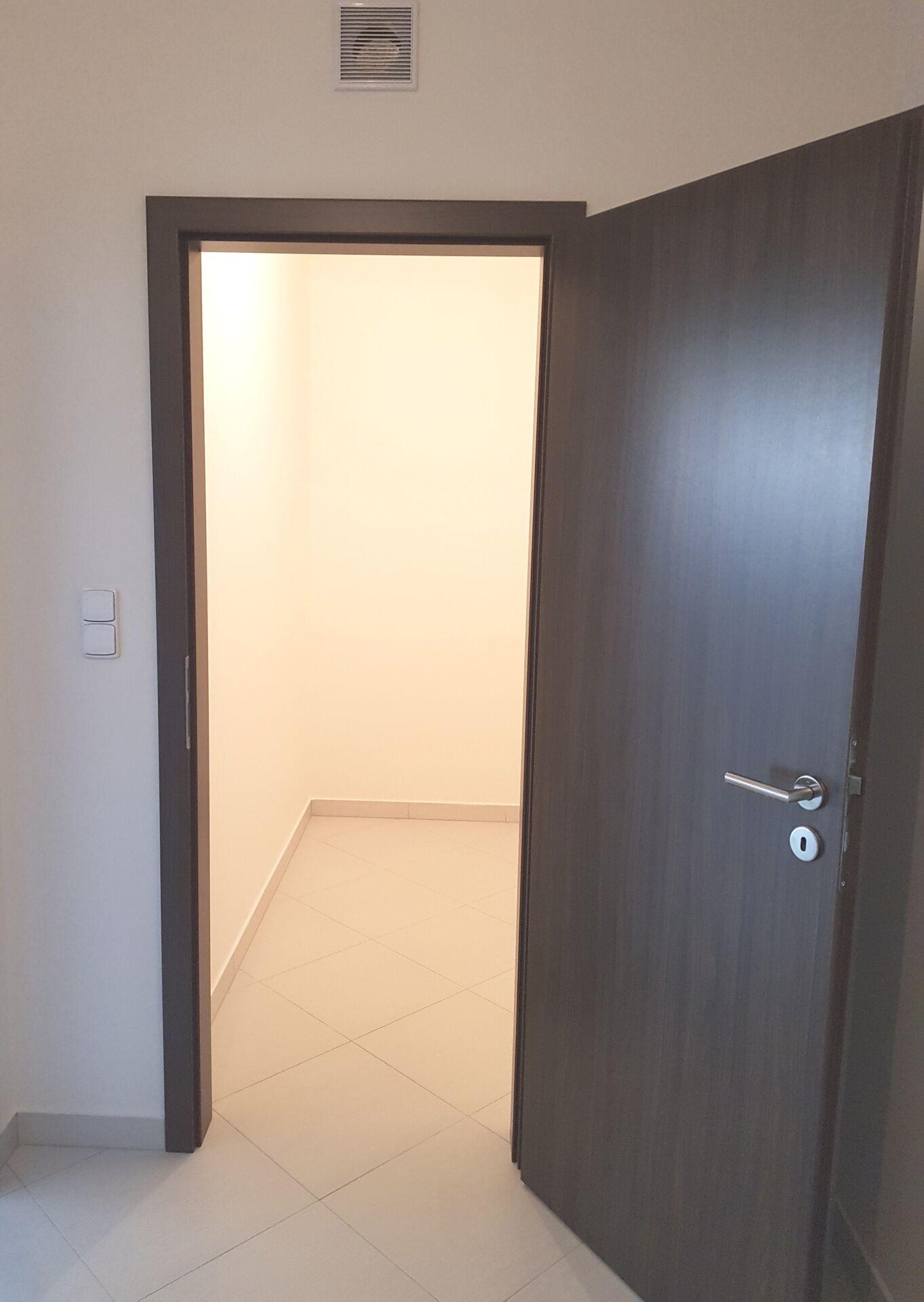 Celý byt je vybaven nadstandardními úložnými prostory. V chodbě je vysoká vestavná šatní skříň až ke stropu, věšáková stěna, zrcadlo.
