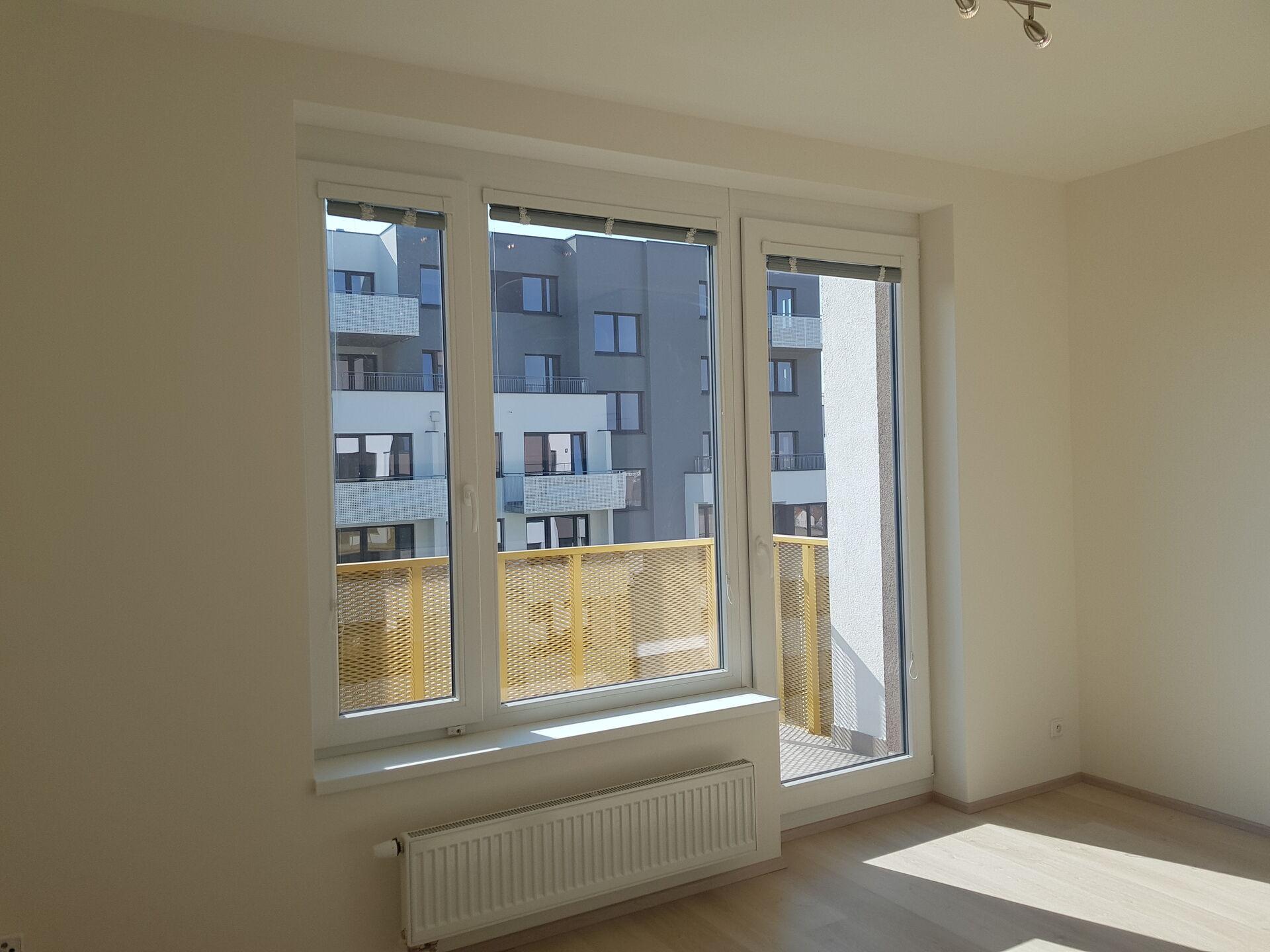 Ve všech oknech a v balkónových dveřích jsou horizontální žaluzie.