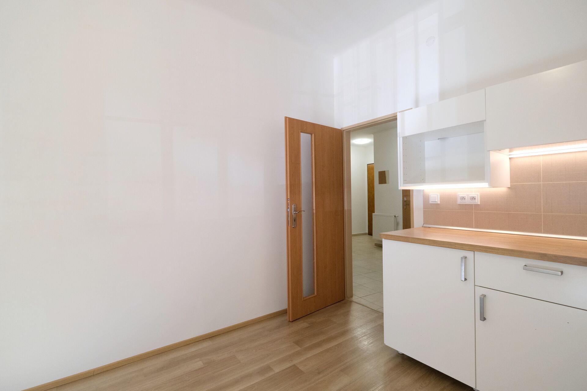 V ložnici je podlaha z renovovaných dubových parket, v kuchyni je moderní linoleum. Zde je dostatek místa na jídelní stůl a menší sofa. Plocha kuchyně je 19,5 m2, ložnice 17 m2. Úložný prostor Vám bohatě zajistí 2 komory přímo v bytě. V menší komora je konstruovaná jako technická místnost s přípojkou na pračku a s plynovým kotlem, který zajišťuje ohřev vody a topení v bytě. Díky etážovému topení můžete regulovat teplotu v bytě po celý rok.