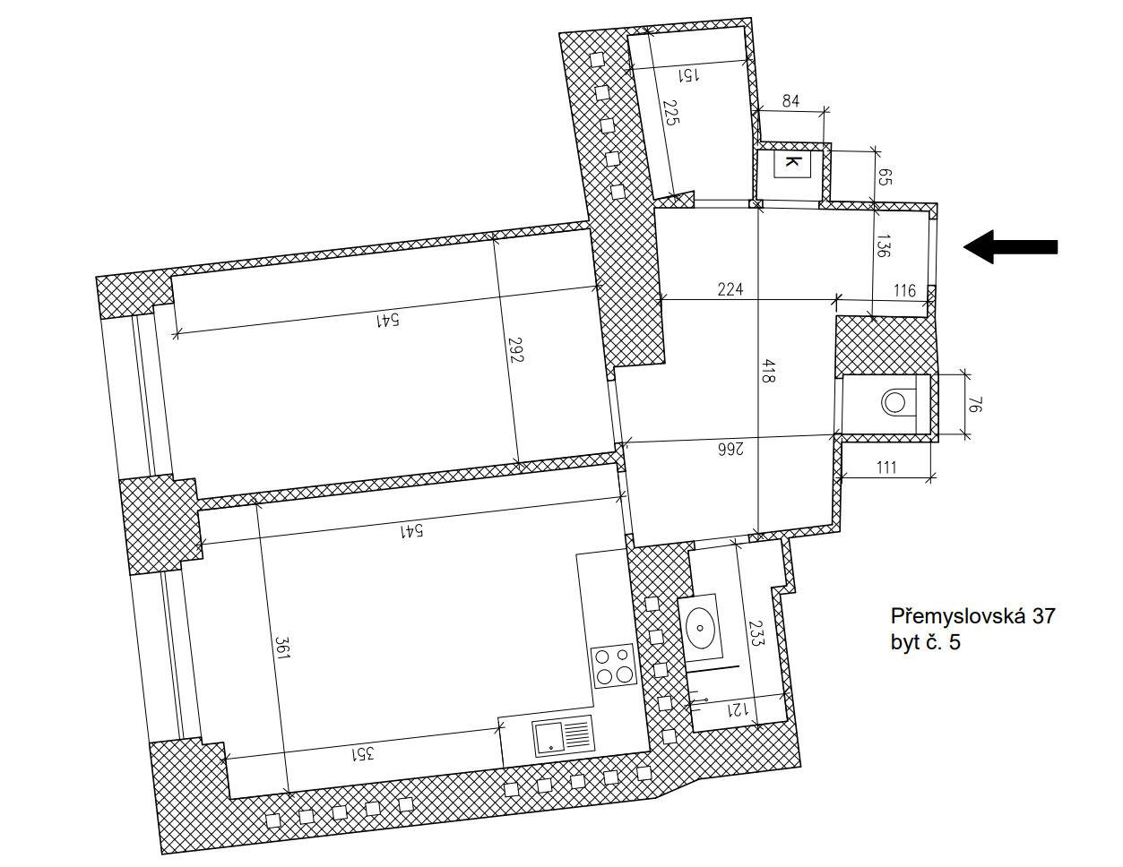Byt je ve zvýšeném přízemí domu, s okny do ulice Baranova - západní orientace. V nové kuchyňské lince je plynová varná deska, digestoř.
