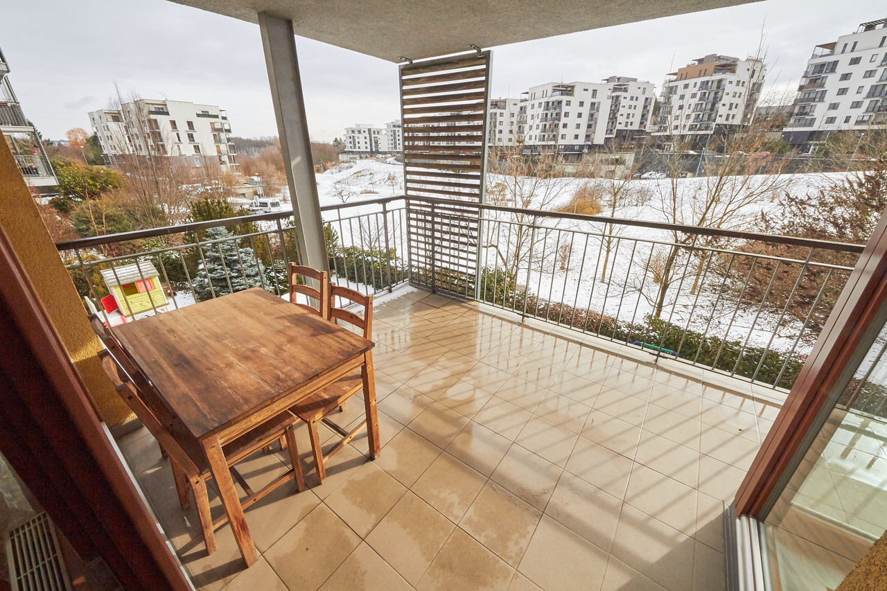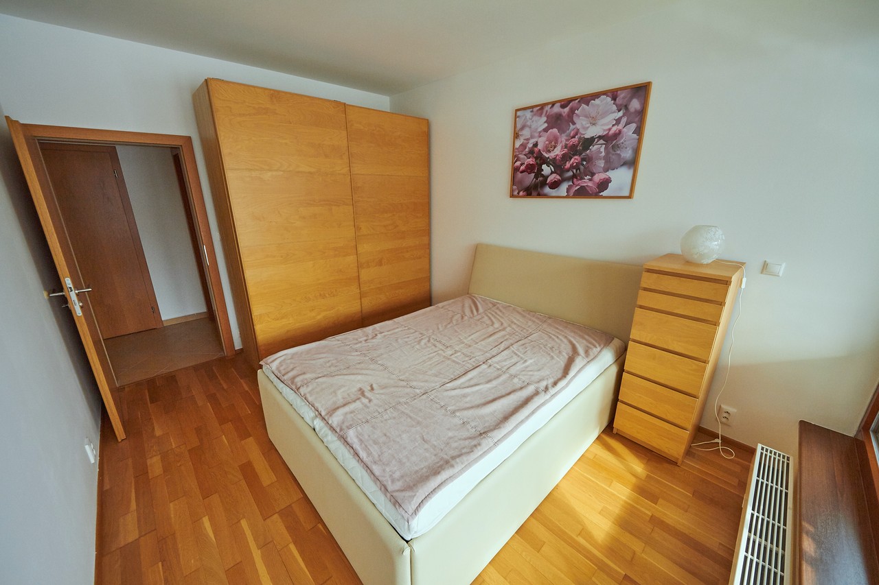 Světlý, slunný byt s prostorným balkonem s hezkým výhledem, v 1.patře domu projektu Zelené město, pronajímán kompletně zařízený. Obývací pokoj 22,5m2 s kuchyňskou linkou s keramickou varnou deskou s digestoří, el. troubou, myčkou nádobí a ledničkou s mrazákem. Ložnice 12,5m2 s dvojlůžkem a skříní. Koupelna s vanou, dvěma umyvadly a topným žebříkem. Samostatné WC, v předsíni k dispozici komora s pračkou a prostorné vestavěné skříně. Z obývacího pokoje i ložnice je vstup na balkon 10,5m2 s hezkým výhledem. Ústřední topení, k dispozici sklepní kóje, v domě optický internet Vodafone (UPC). Možnost pronájmu garážového stání. Volné ihned.