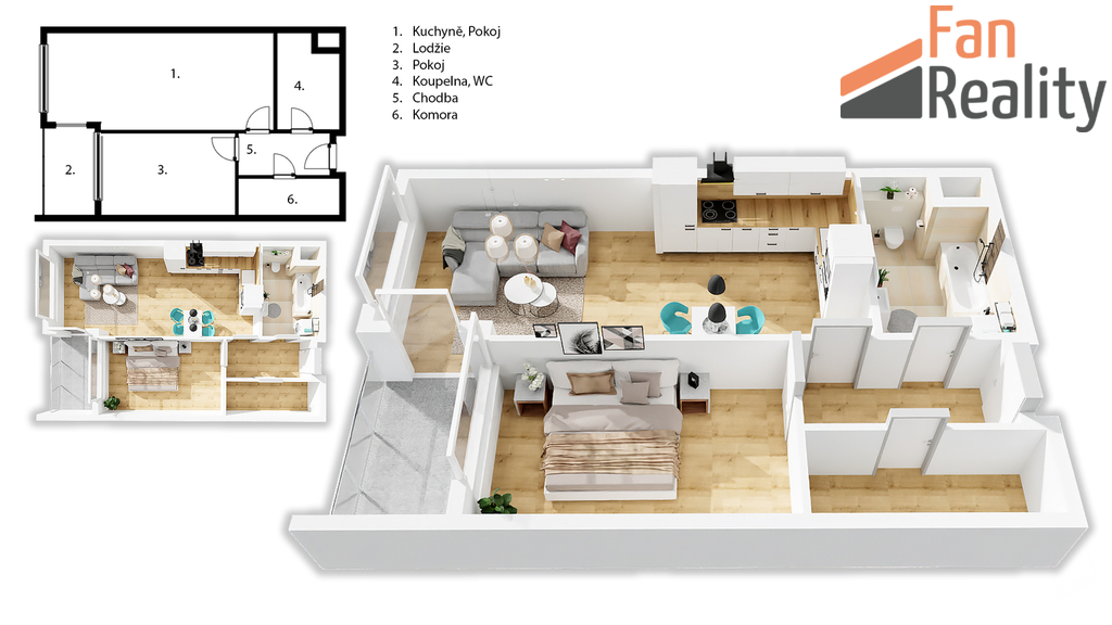 Dispozici tvoří obývací pokoj s kuchyňským koutem, samostatná ložnice, koupelna s vanou, vstupní chodba, komora a lodžie vhodná pro příjemné posezení.