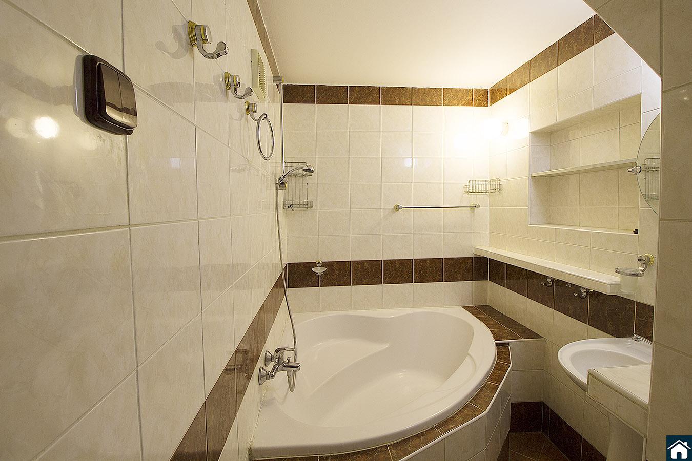 V bytě je vestavěný úložný prostor také je k dispozici komora, Koupelna je zařízena rohovou vanou, WC je samostatné. Etážové vytápění a ohřev vody je vlastním kombinovaným kotlem.