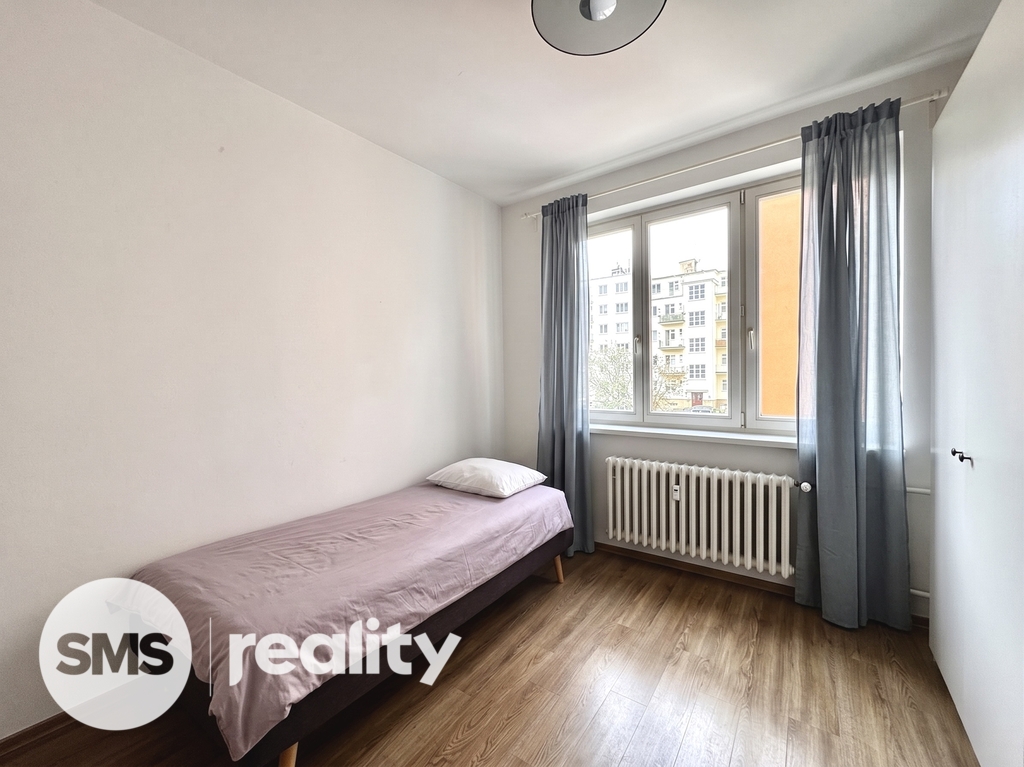 Dispozice je promyšlená: z prostorné vstupní haly jsou samostatně přístupné všechny pokoje – obývací pokoj, ložnice, druhý pokoj i koupelna s vanou a samostatným WC. Žádné průchozí místnosti. Ložnice je orientovaná na sever do vnitrobloku. Obývací pokoj a druhý pokoj jsou orientovány na jih do ulice, takže odpoledního světla je tu víc než dost.