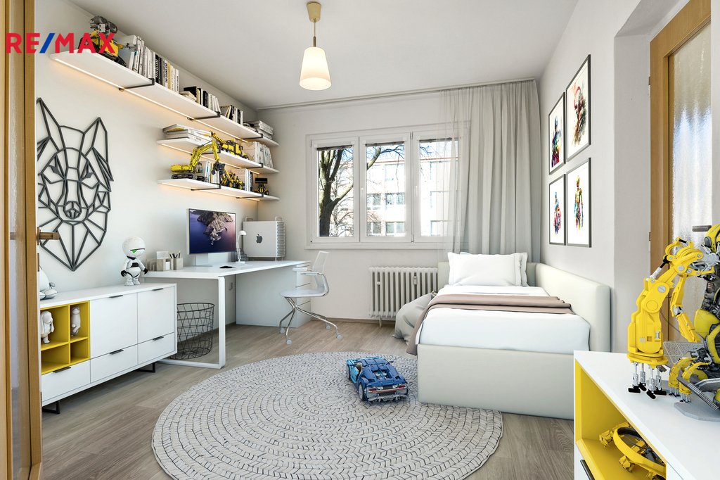 Byt sestává z velkého obývacího pokoje, 2 dalších pokojů (všechny pokoje neprůchozí - vhodné na pronájem), kuchyně, předsíně, koupelny a samostatného WC. K bytu náleží hezký sklep v suterénu domu. (V inzerci jsou použity vizualizace možného zařízení pokojů).