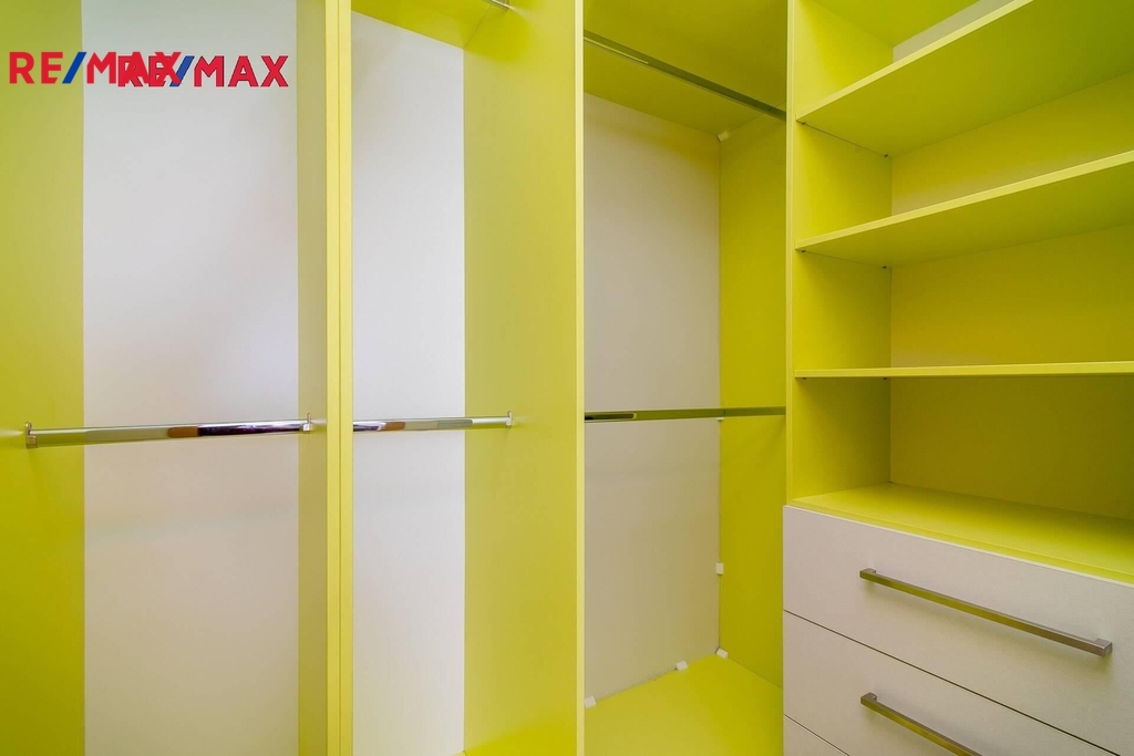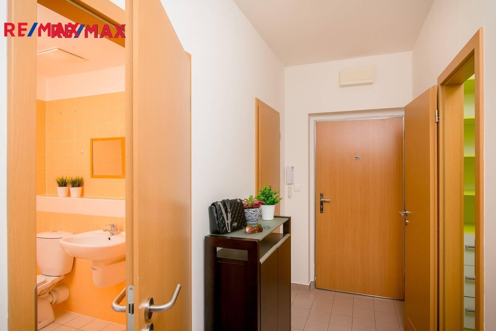 Byt je velice světlý a prostorný. Ze vstupní chodby je vstup do šatny (4, 5m2) s úložným systémem na míru, dále do samostatné komory a rozlehlé koupelny (5, 5 m2) s vanou a pračkou.