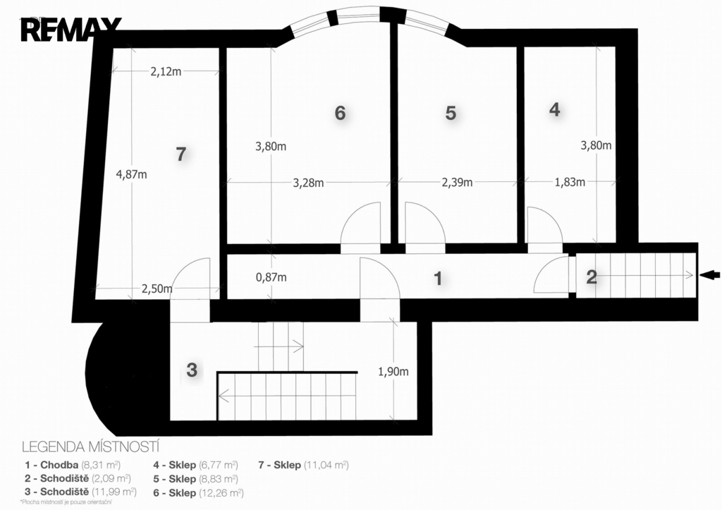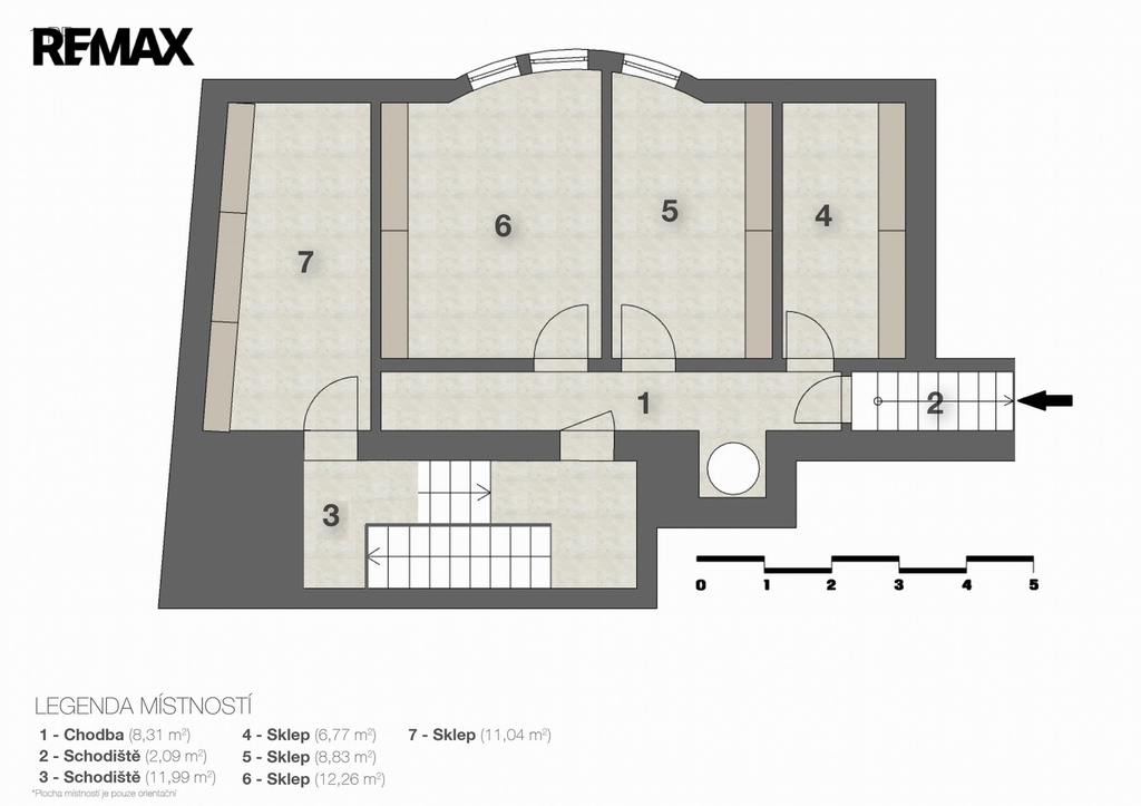 Rozsáhlé sklepní prostory se samostatným vstupem lze využít jako ateliér, dílnu, fitness či vinotéku. Čtyři propojené místnosti a chodba tvoří plnohodnotný funkční celek, který významně rozšiřuje užitnou hodnotu bytu.