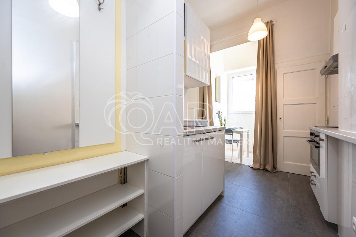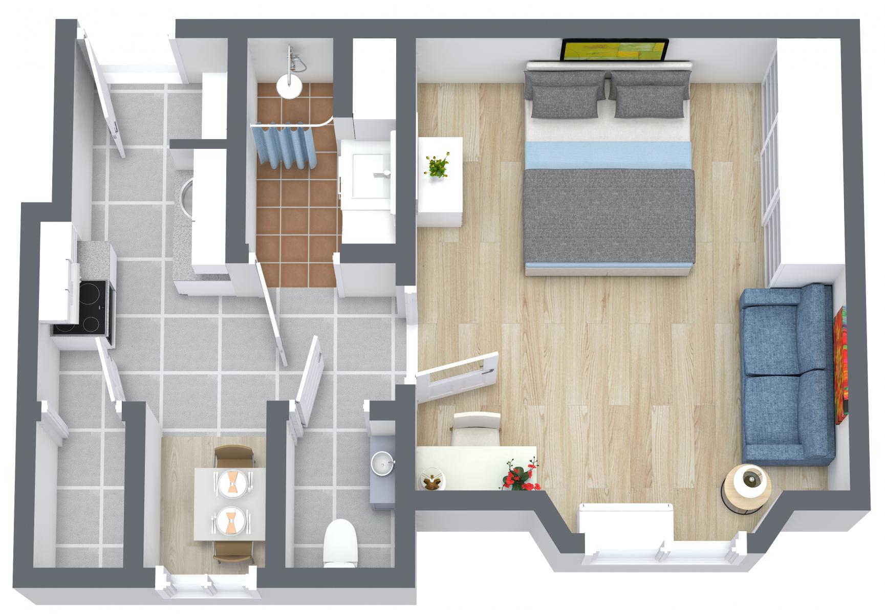 Po vstupu do bytu Vám je k dispozici menší zádveří, kde si můžete odložit kabát či boty. Poté vstoupíte do prostoru kuchyně, která po levé straně nabízí úložné prostory a kuchyňský dřez, po pravé straně pak troubu s varnou deskou. Zároveň ve výklenku můžete využívat jídelní stůl, který díky dostatku světla může stejně tak skvěle posloužit jako pracovní kout. Z prostoru kuchyně je pak přístupná koupelna se sprchovým koutem, přirozeným odvětráváním do světlíku a bojlerem, který zajišťuje ohřev vody. K užití je také pračka, která je schovaná pod deskou s umyvadlem a nikde tak zbytečně nepřekáží, jak to v bytech této dispozice často bývá. V případě párového soužití jistě oceníte, že toaleta je samostatná.