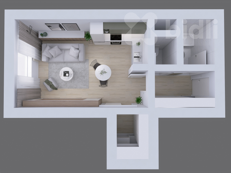 V inzerci jsou kromě reálných fotografií použité i vizualizace bytu po případné rekonstrukci.