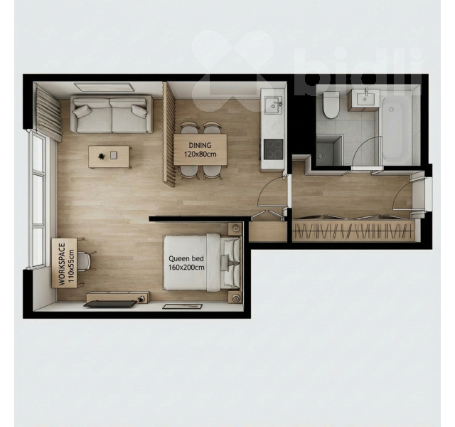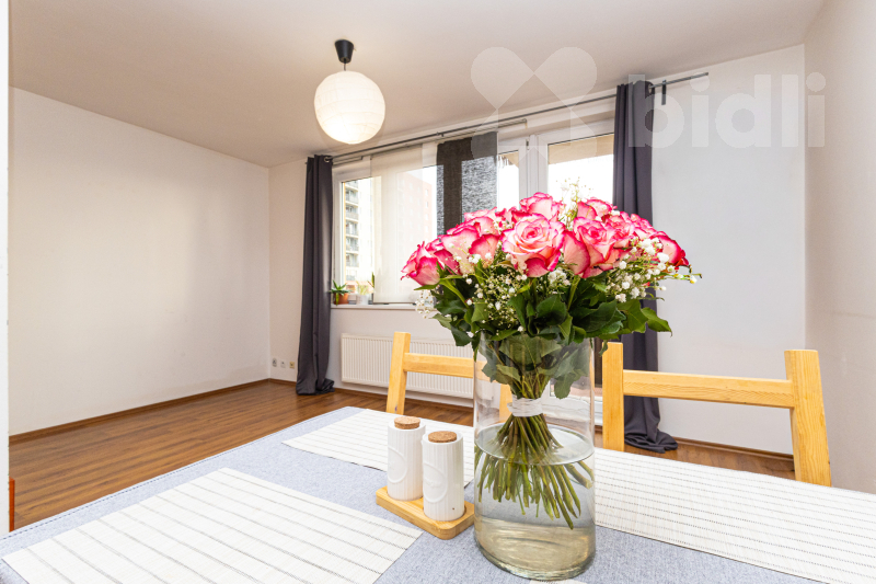 Dispozice bytu je prakticky rozdělená příčkou, která přirozeně odděluje obývací a spací zónu. Byt působí vzdušně a nabízí komfortní městské bydlení.