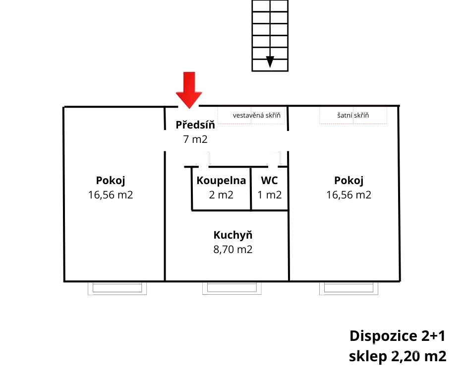 Celková plocha: předsíň 7 m2, kuchyň 8,70 m2, pokoj 16,56 m2, pokoj 16,56 m2, koupelna 2 m2, WC 0,87 m2, sklep 2,2 m2.