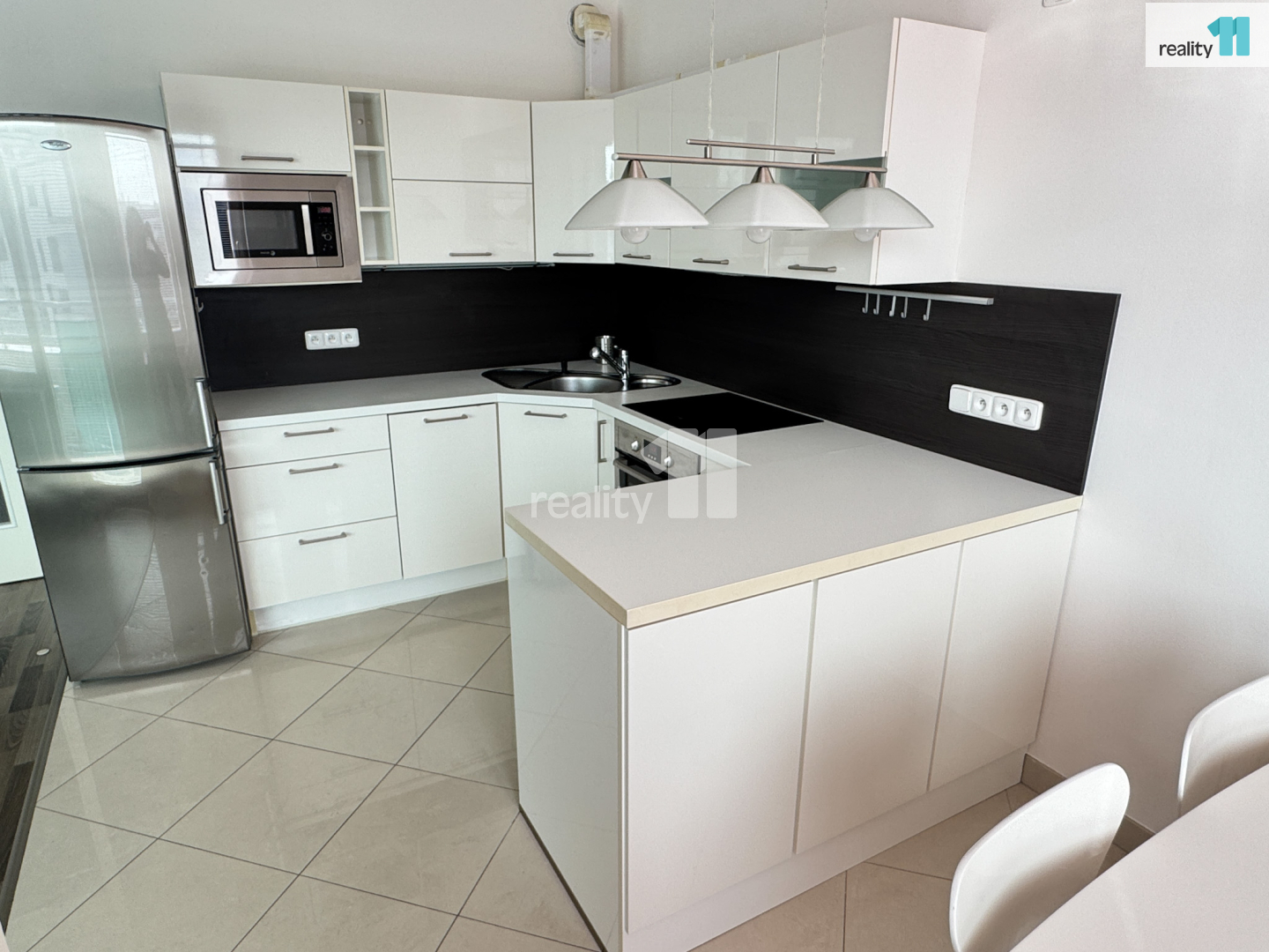 Kuchyňská linka je plně vybavena: varná deska, trouba, mikrovlnná trouba, myčka, lednice i digestoř.