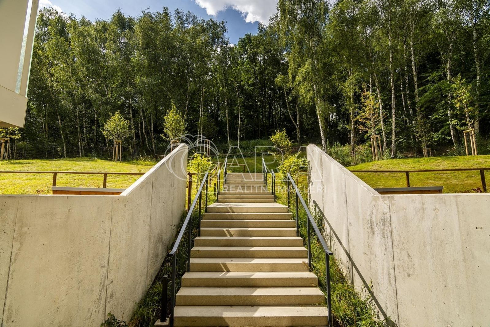 Z obývací místnosti a ložnice je vstup na velký balkón (11,7 m2), ze kterého je výhled do zahrad a nádherného parku, kde rostou břízy.