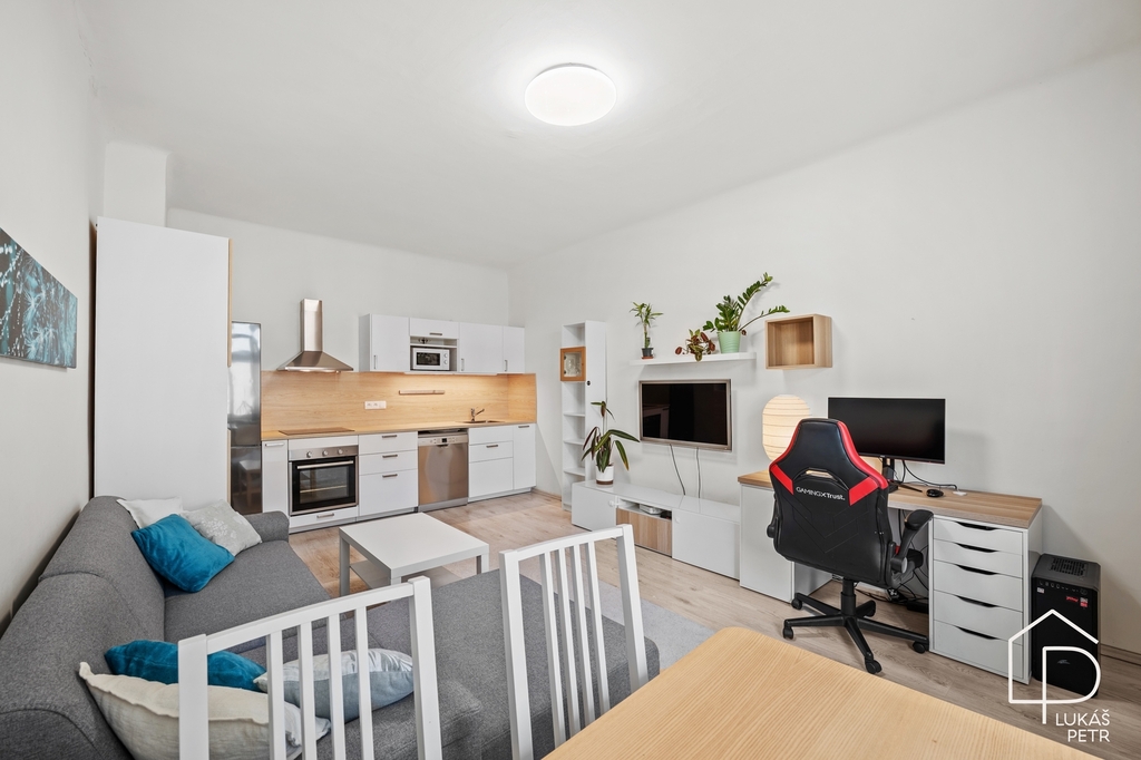 Dispozice je praktická a přehledná – obývací pokoj s kuchyní, samostatná ložnice, koupelna s vanou a samostatné WC. Byt má zděné jádro, plastová okna a laminátové podlahy. Příjemným detailem je také větrací okénko v koupelně i na WC.