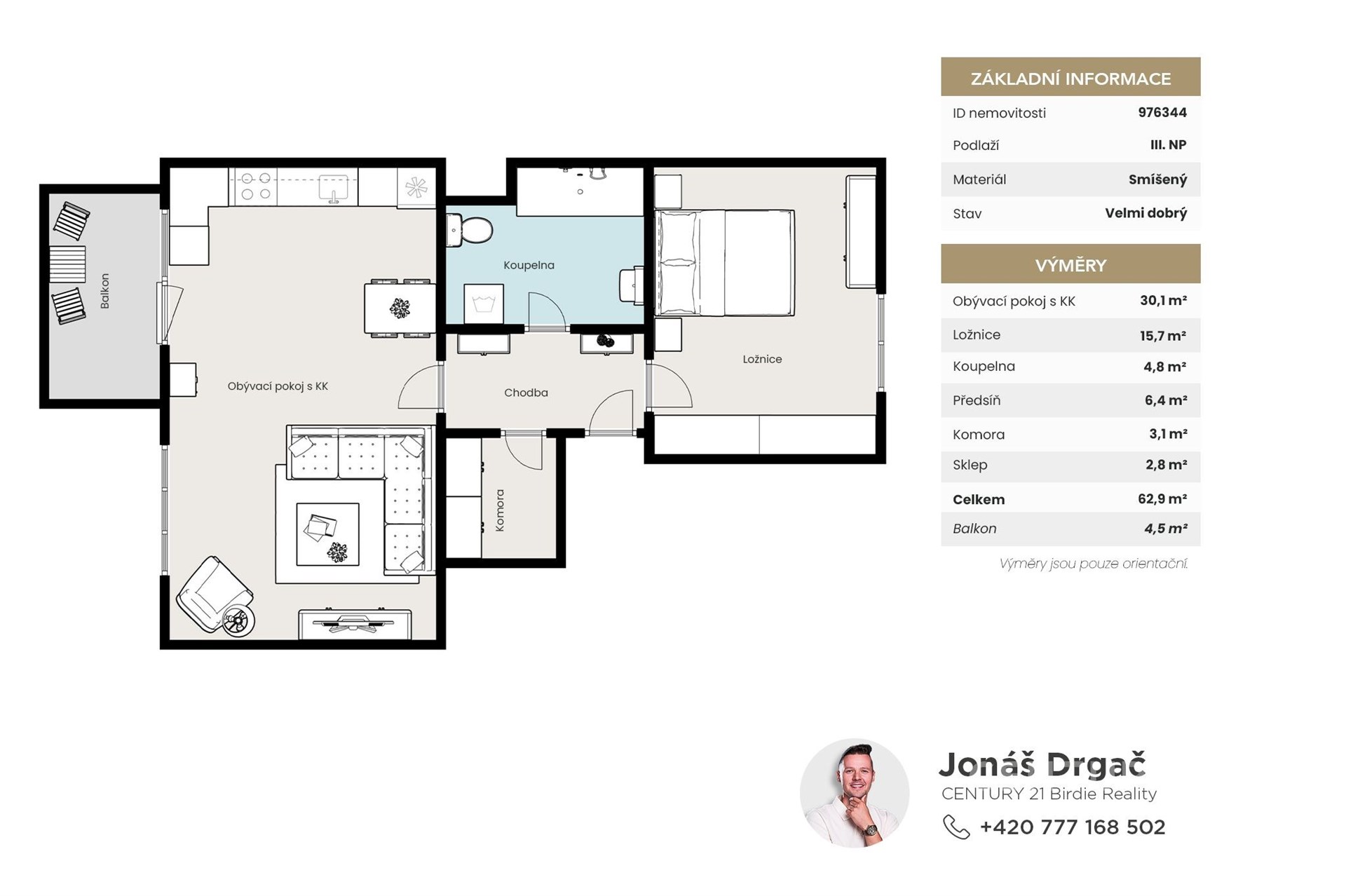 Dispozice a plocha: Velmi prostorné 2+kk (62,88 m²) + balkon (4,5 m²) + sklep (2,76 m²).
