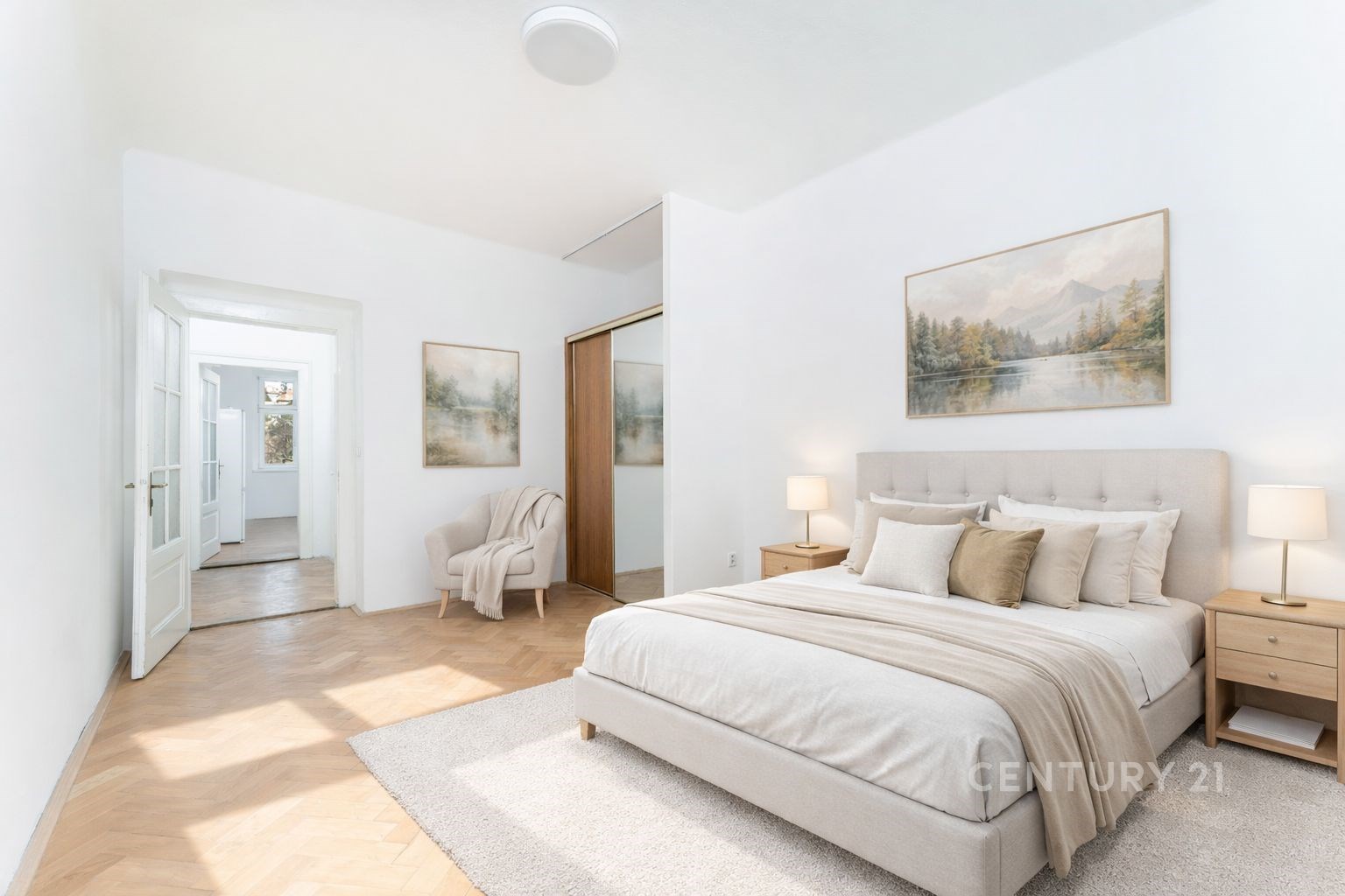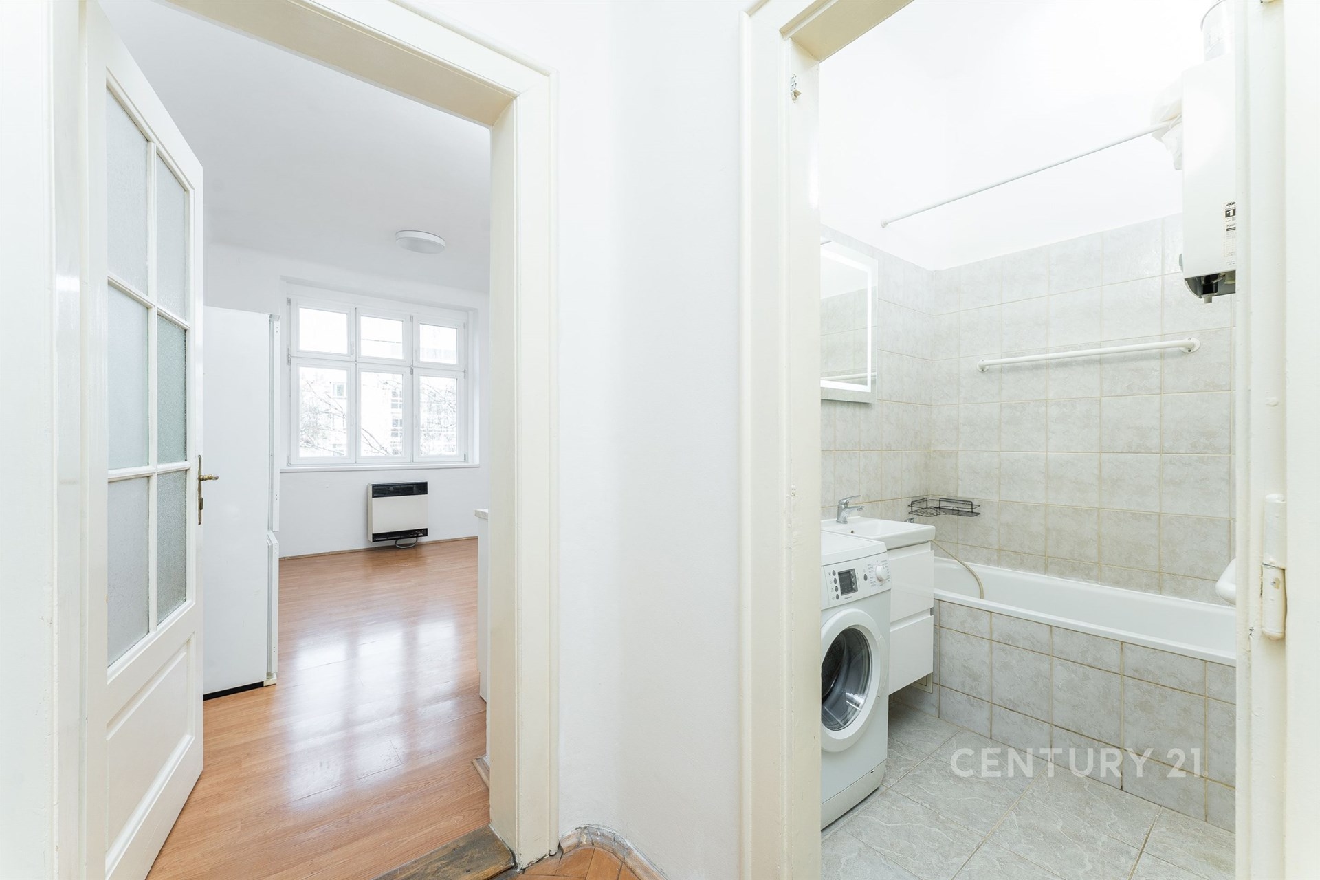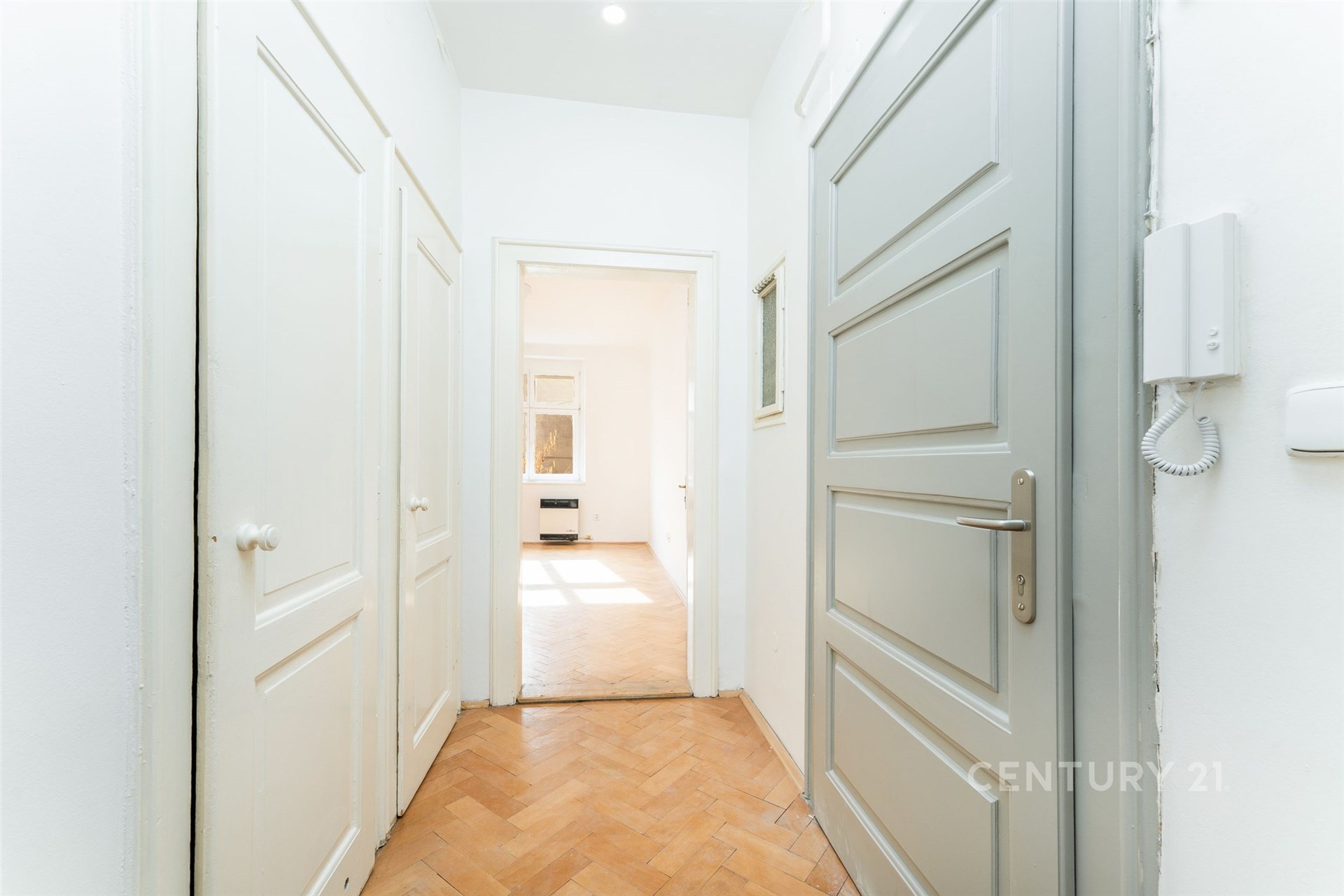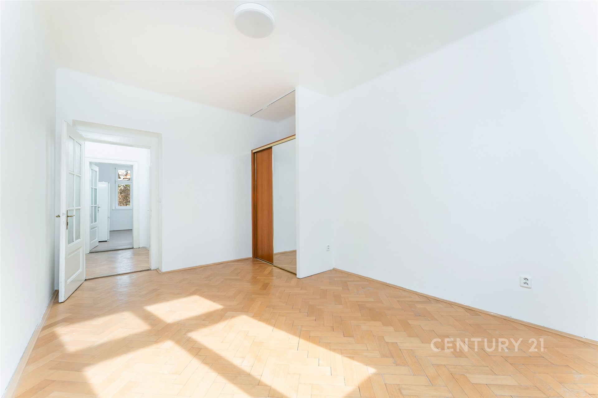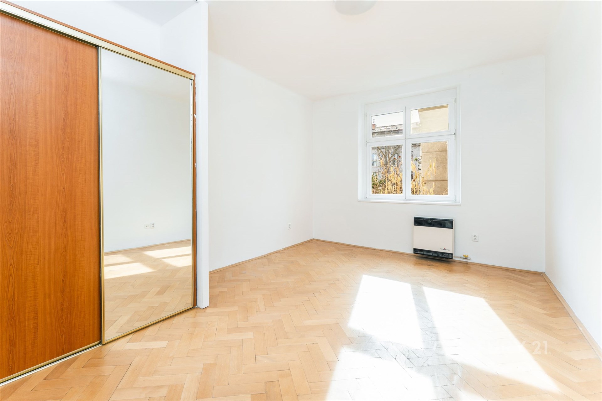 Samotný byt se nachází ve třetím nadzemním podlaží. V jedné z místností jsou na podlaze parkety, které dodávají interiéru teplo a eleganci, ve druhé místnosti s kuchyňským koutem je položena plovoucí podlaha. Okna s trojskly zajišťují klid i tepelný komfort, dřevěné interiérové dveře a obložky podtrhují autentickou atmosféru bytu. Praktickou součástí dispozice je spižírna u kuchyně.