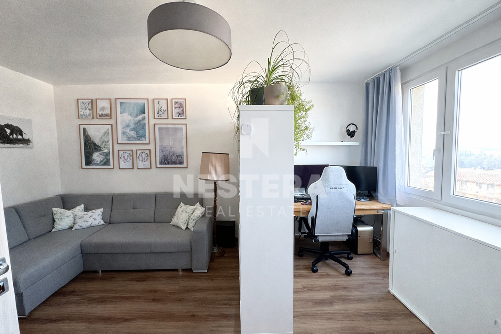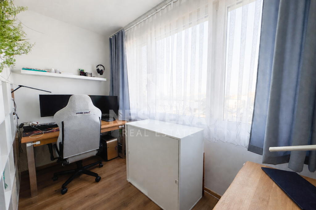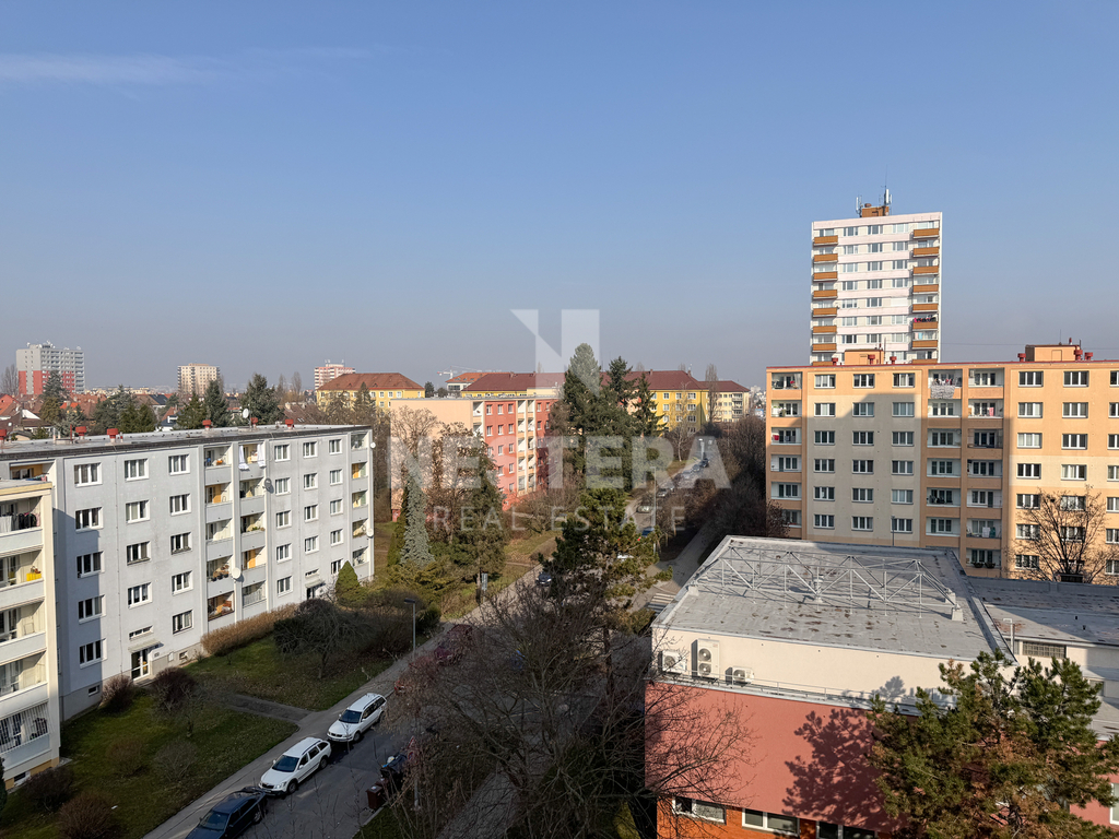 Díky umístění ve 7. patře je byt velmi světlý a nabízí otevřený výhled do okolí. Okna jsou plastová a orientována na západ a sever, což zajišťuje dostatek přirozeného světla během dne.