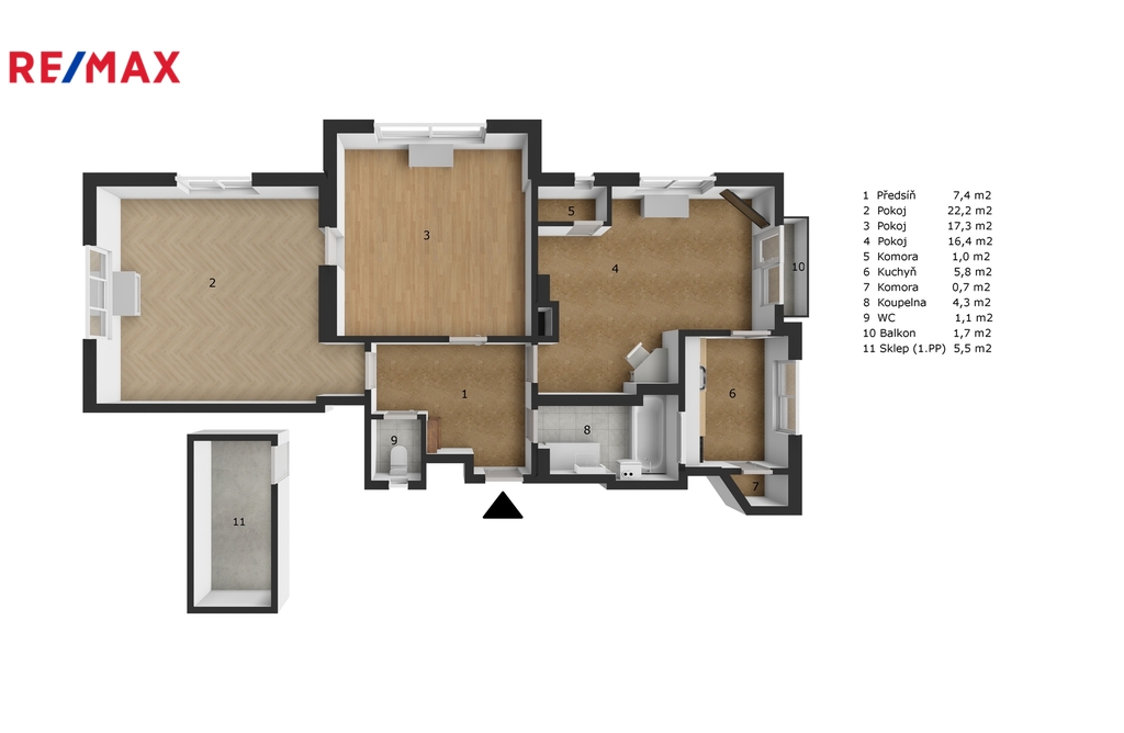 obývací pokoj 22,2 m2, ložnice 17.3 m2, pokoj/jídelna 16,4 m2, kuchyň 5,8 m2, koupelna 4,3 m2, WC 1,1 m2, předsíň 7,4 m2, 2x komora 0,7 a 1,1 m2, balkon 1,7 m2 a sklep 5,5 m2.