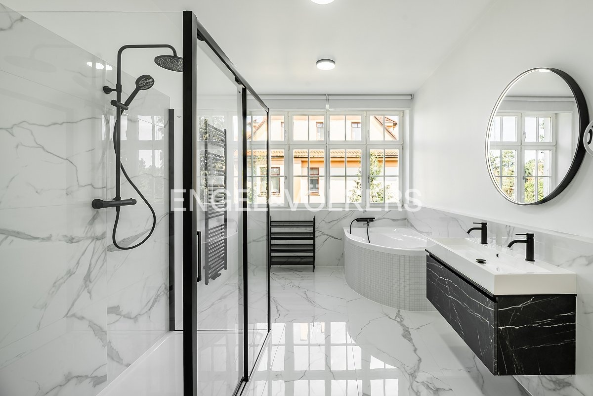 Krásná koupelna se sprchovým koutem, vanou a toaletou. Je zde i samostatná toaleta. V technické místnosti naleznete plynový kotel. Byt je částečně zařízený, po dohodě je možné dodat další vybavení. Je možné využívat společnou zahradu. Parkování je možné na pozemku za dálkově ovládanou branou pro 1-2 automobily.