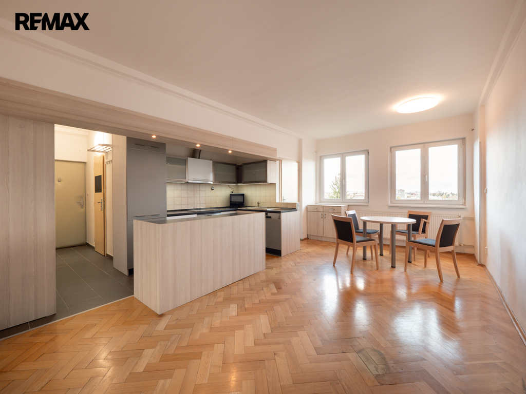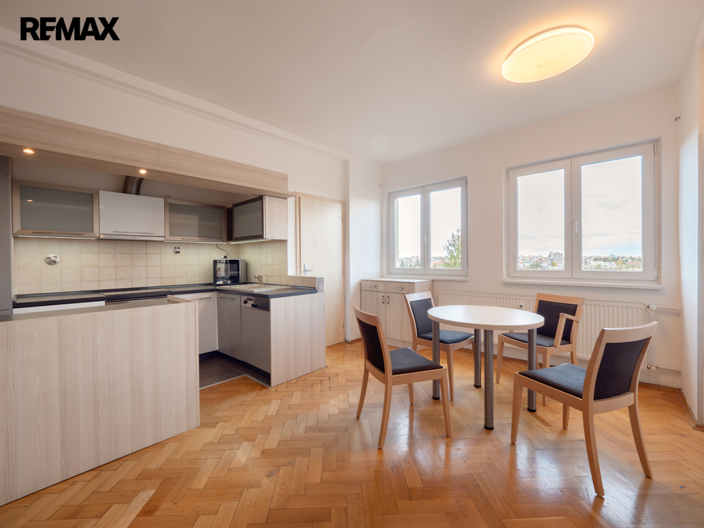 Celková rekonstrukce v letech 1997 a následně 2012 byt proměnila v útulné a praktické bydlení s místností navíc, a přitom bytu zanechala vzdušnost. Kuchyňská linka s varnou deskou a moderním ostrůvkem splňuje veškeré požadavky pro šikovné kuchaře. V obývacím pokoji a kuchyni jsou instalovaná chytrá svítidla s možností tlumení a výběru teplého i studeného světla. Na podlahách jsou dřevěné parkety a dlažba.