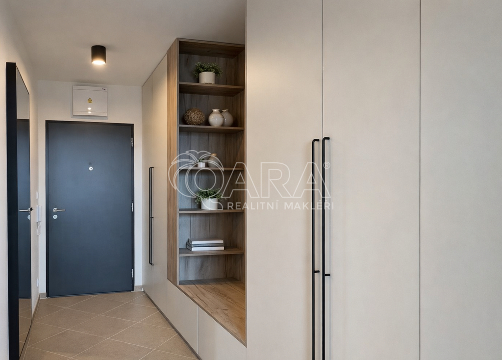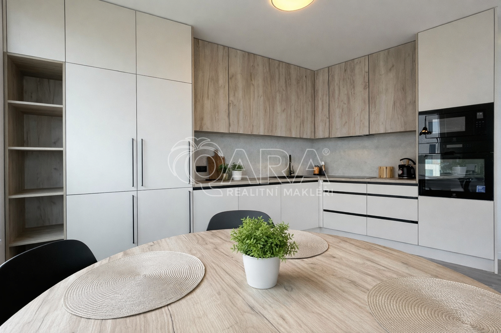 Interiér bytu je zařízen v moderním stylu s důrazem na kvalitu a praktičnost. K dispozici je plně vybavená kuchyňská linka se všemi spotřebiči, vestavné skříně poskytující dostatek úložného prostoru a nábytek na míru v obývacím pokoji. Ložnice je doplněna o pracovní kout, což ocení zejména zájemci pracující z domova. Velkým benefitem je komora přímo v bytě a další úložný prostor ve formě komory na patře.
